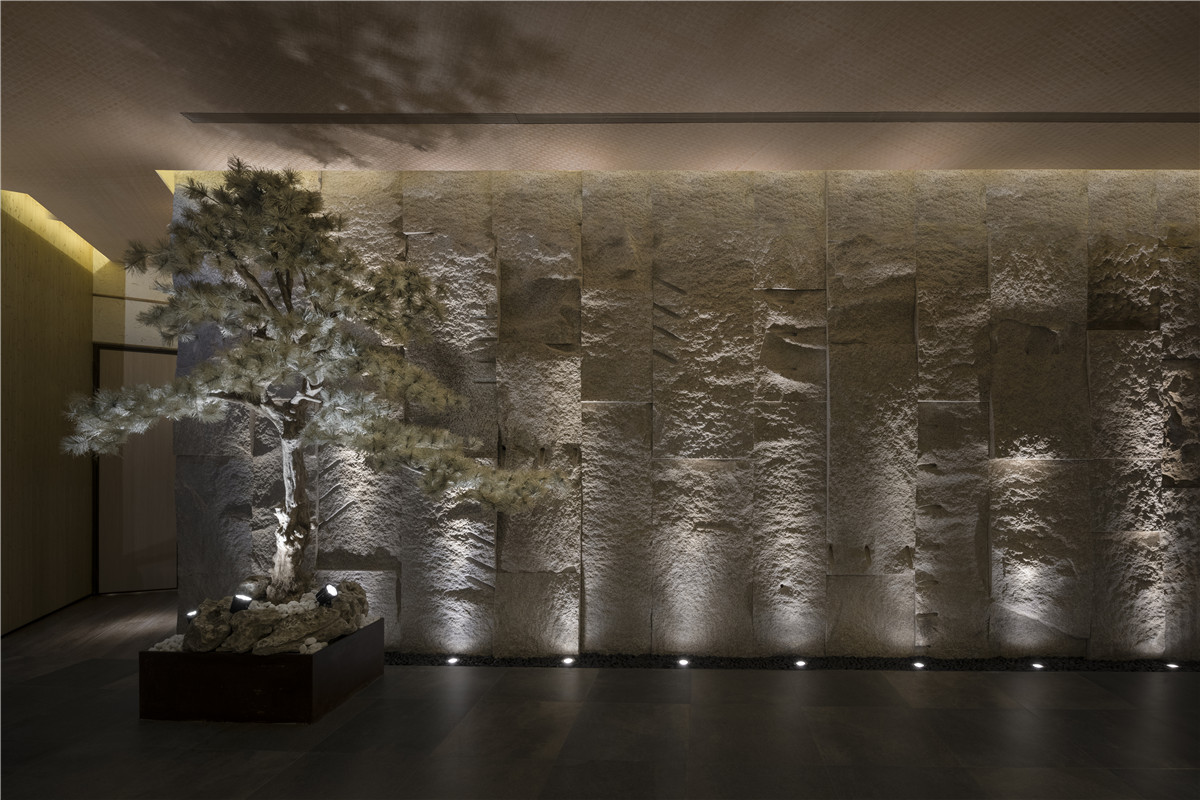 沿着水上步道缓步徐行,眼前建筑体的峥嵘线条加上比例反差,让虫柱原木特制的大门,感觉上像极了有趣的洞穴入口。进入后,迎面一道宏伟凿岩墙,巧妙完成动线引导与空间界定,并与优雅的松、景石构成别出心裁的迎宾景观。