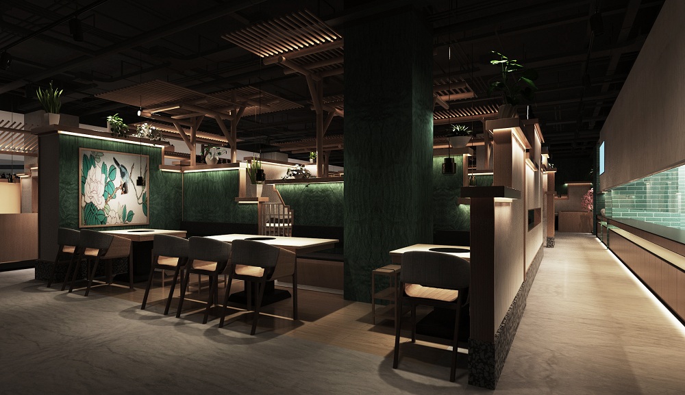 在前期的调研中设计师对猪肚鸡火锅的产品梳理出几个关键词“民间”“广东”“传承”“养生”等属性,我们5DD餐饮设计师结合当下年轻多元的时尚元素,以简洁优雅作为空间定位的基调,营造出惬意舒适的用餐环境。在空间设计上更多的考虑是对于品牌运营,如何在现今激烈的商业环境中快速模块化、数据化更新的理解和思考.从品牌形象、视觉设计到空间规划,透过色彩、材质等不同元素的运用,创造出美食与空间的动态链接,用时尚、优雅的设计迎接每一位前来享用美味火锅的食客。