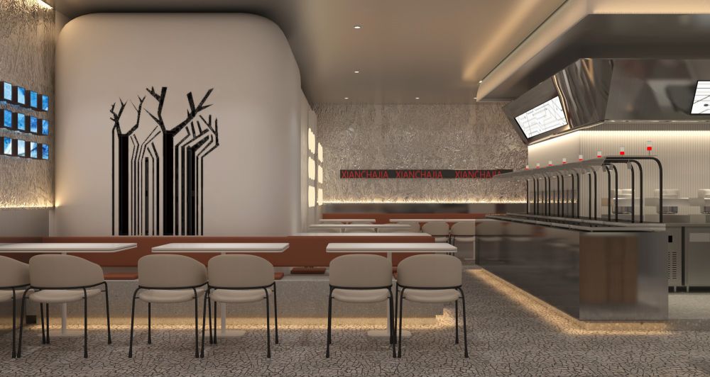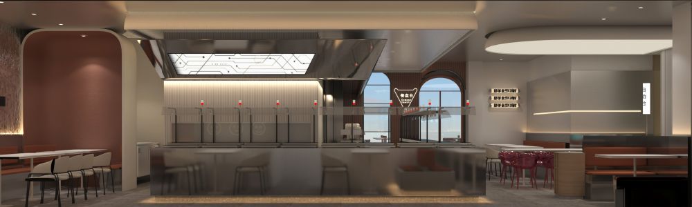 在室内空间上,我们对整体进行自由分割,确保每个空间自由且独立。开放性的选菜和机器人炒菜机一览无余,开放性和自由度的提升,独立不失融洽,冷且极具工业感的不锈钢强化了机器人智慧餐厅的主题,