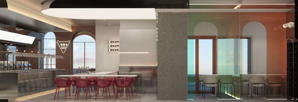 室内沿袭了外观的简约与内敛,以奶白色和高级灰为主调,辅以咖啡色,炫彩玻璃等为空间注入清新、自然、时尚的意蕴,奠定一种温馨、治愈的社交氛围。设计师运用现代建筑思维方式,从曲线与直线的组合中,撷取并延伸出有规律的形体来构筑空间关系,打造通透开阔、层次分明的餐饮环境。