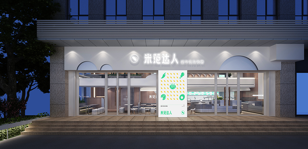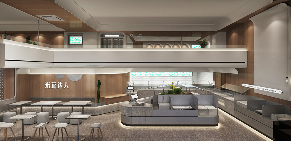 整个门店的设计,以现代简约的设计手法进行构建,色调明亮、清爽;以一粒米为主题,抽象提取米的弧度和曲线,为空间增添了不少活力和趣味性,加强了品牌文化的呈现,提升了米范达人的品牌辨识度和号召力。