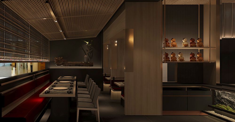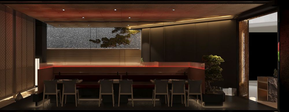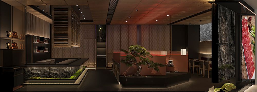 结合现场设计了一个不大的入口门厅,入口以一棵黑松傍石而立,树下苔藓蔓绕,砾石满铺。门厅不大但仪式感满满,让食客能够跟随规划的动线逐步沉浸到餐厅的场景氛围之中。整个空间融入“游园”的理念,门头采用腐蚀金属板造型,斑驳痕迹犹如和牛被烤的状态,