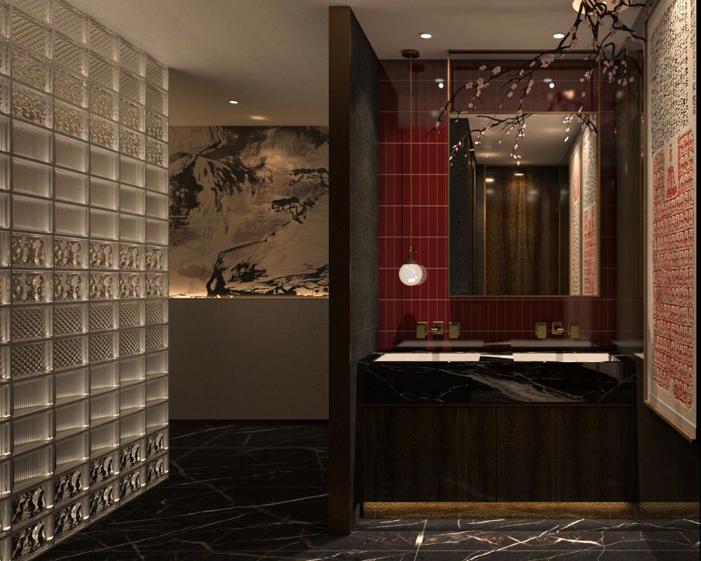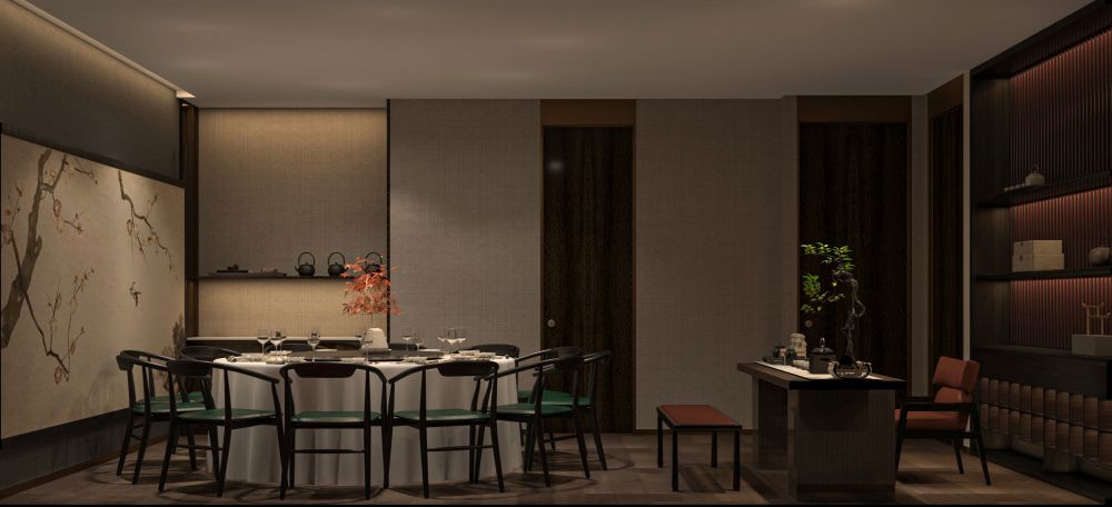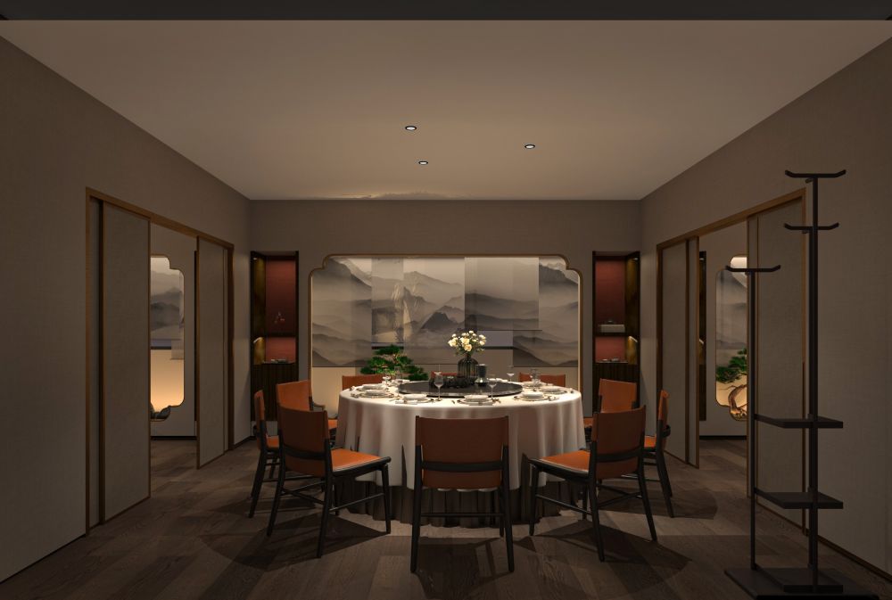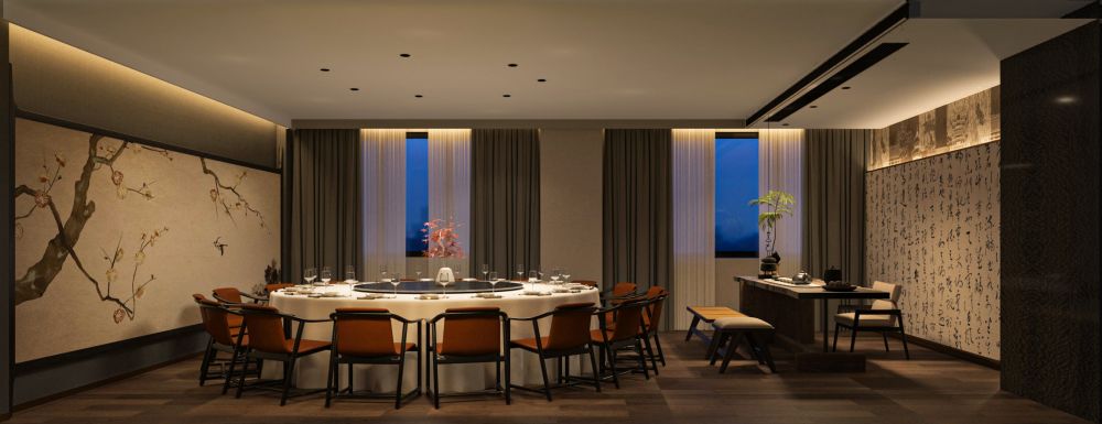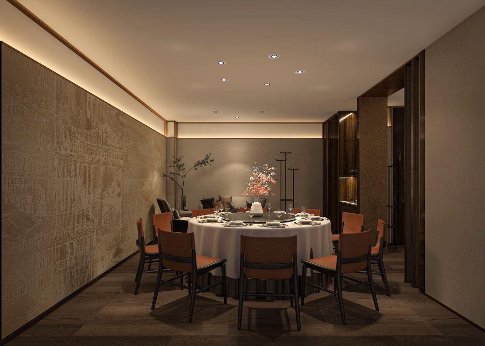 餐厅的定位是为精致高级的苏式菜品牌,包厢占比大。因此,设计师对建筑的内在空间进行了合理化布局,使用深色木饰面结合白色石材,地面用劳伦黑金大砖,把原本不大的前厅,设计成充满江南朦胧韵味的散客区,奠定整个空间的基调与品格,使这里成为顾客的第一道视觉盛宴。结合墙面上的竹、艺术墙布等装饰