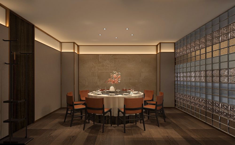 设计师用玻璃砖元素围合出几个包间,通过玻璃砖的反射、折射等作用,强化包间内采光的同时延伸距离感,深化虚实感,达到源于物象又超越物象的境界,营造自由而惬意的审美体验。