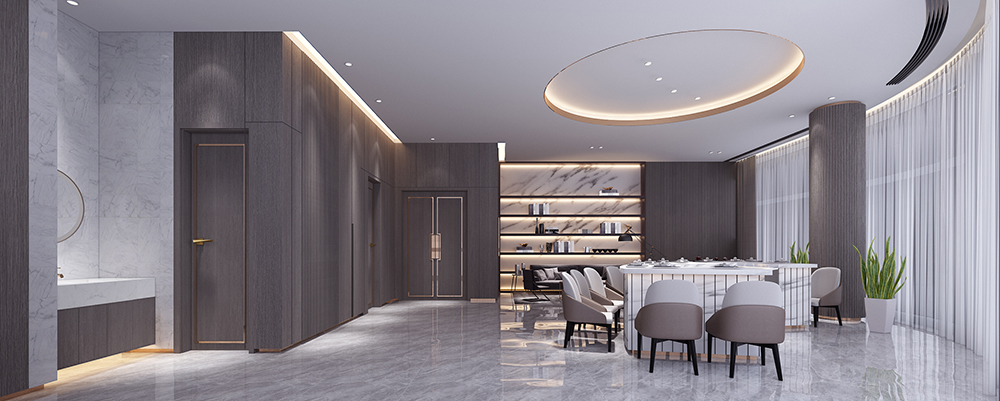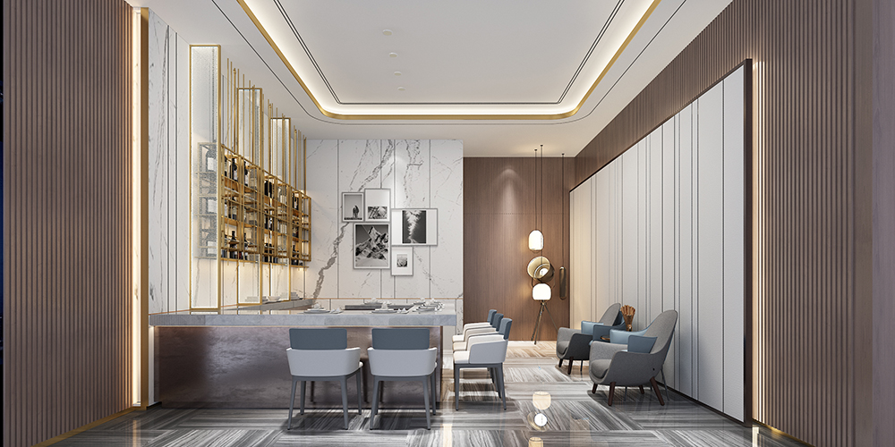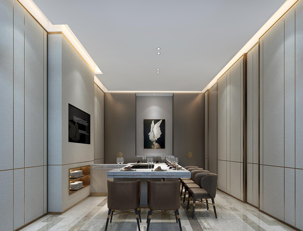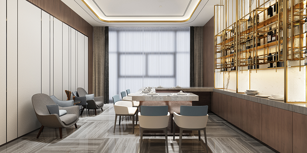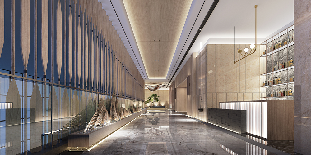秦皇岛因秦始皇东巡至此派人入海求仙而得名,希望从水和海洋为灵感切入,同时顺应整个万怡酒店的现代轻奢氛围,结合精致奢华用餐体验,从入口开启了一次扬帆远航,船桨造型的阵列和水纹玻璃赋予的海洋寓意,让空间故事揭开探寻的序幕。