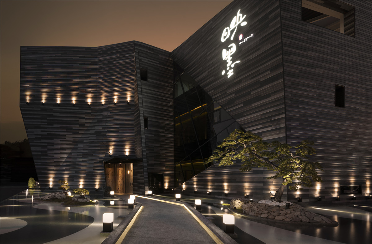 高达 15 米的“映墨”占地广袤,远望的形态宛如一方腰间缀着星光、巨大的折曲盒子,这独特的外型以稳定钢构支撑骨架,接着在不同角度,搭配耐候的三色塑化木与强化玻璃,琢磨出富于想象力与工艺精神的衔接面。
