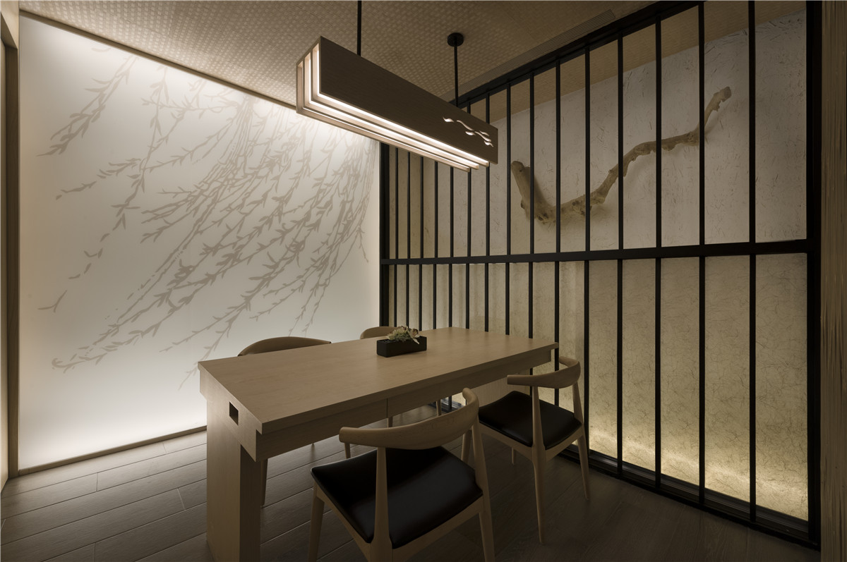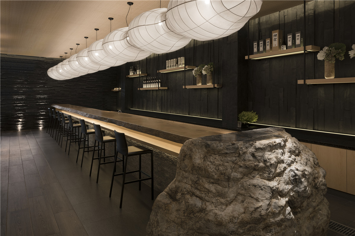 墙前右转处,规划一座跨距超长的卡布里台,一端原石剖面饶富机趣,恰与原木台面、左侧黑色版岩墙、大型竹蔑灯笼等元素相呼应,能量饱满的多种自然语汇,加上墙面错落悬挂的铁件层架,经由底部灯光烘托架上清酒等风物,缜密构思起承转合,让来客可以一边享受手工美食,一边感受空间令人放松、沉静的本质。