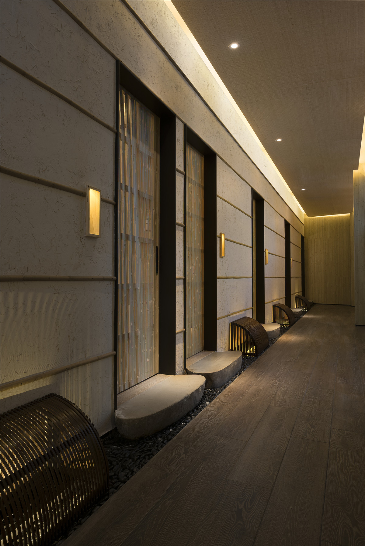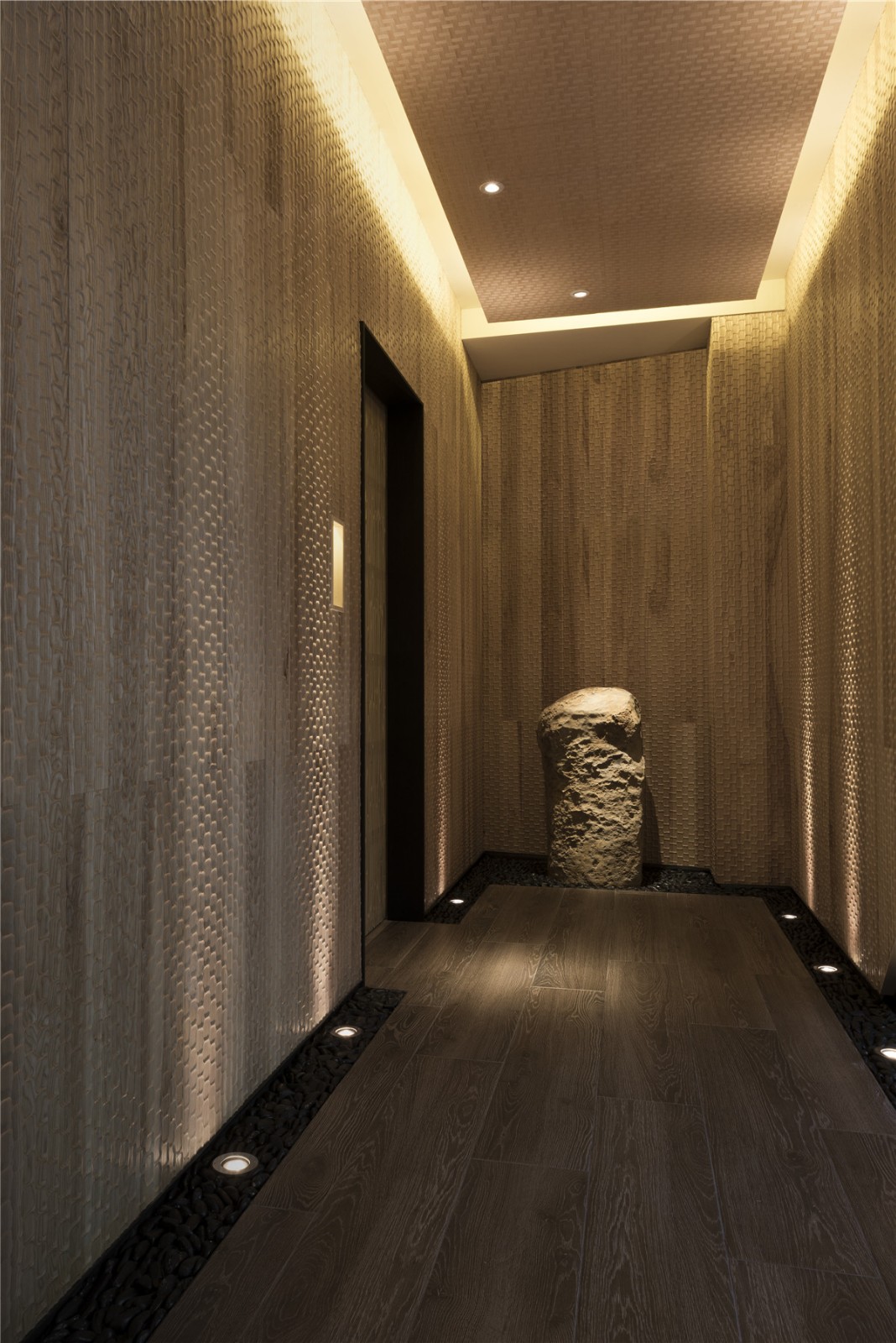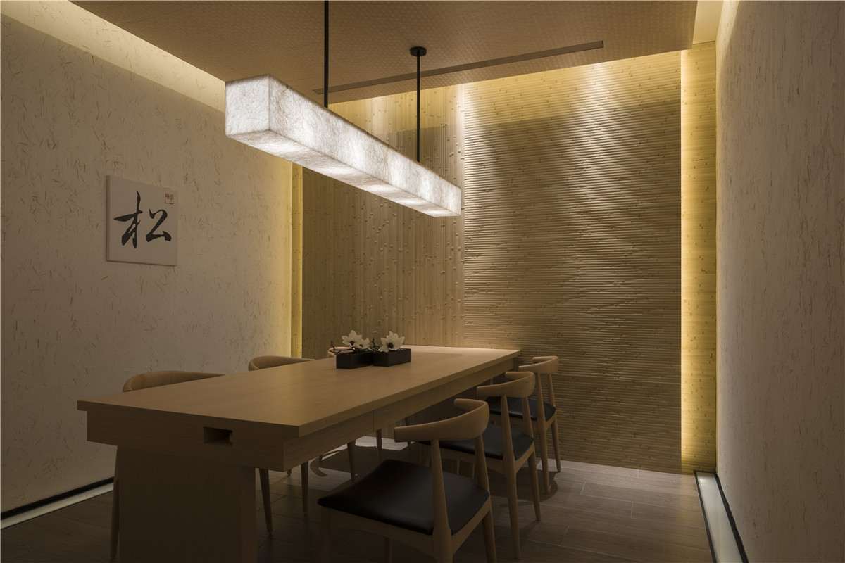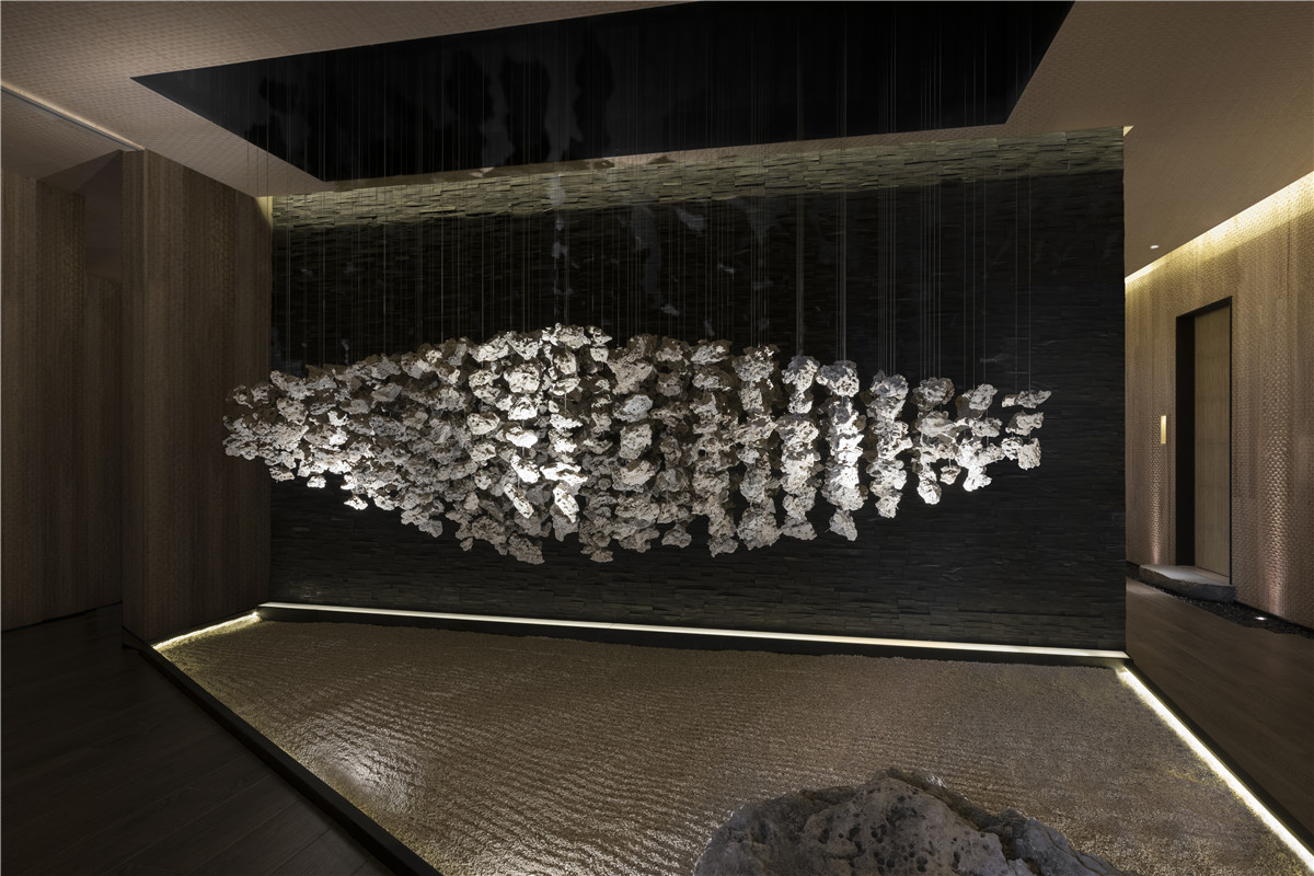 沿着水上步道缓步徐行,眼前建筑体的峥嵘线条加上比例反差,让虫柱原木特制的大门,感觉上像极了有趣的洞穴入口。进入后,迎面一道宏伟凿岩墙,巧妙完成动线引导与空间界定,并与优雅的松、景石构成别出心裁的迎宾景观。