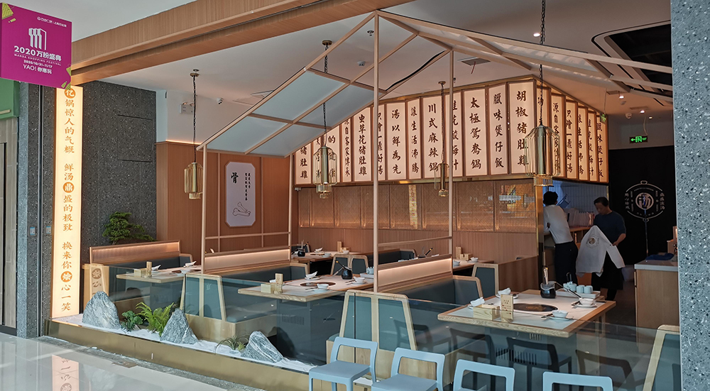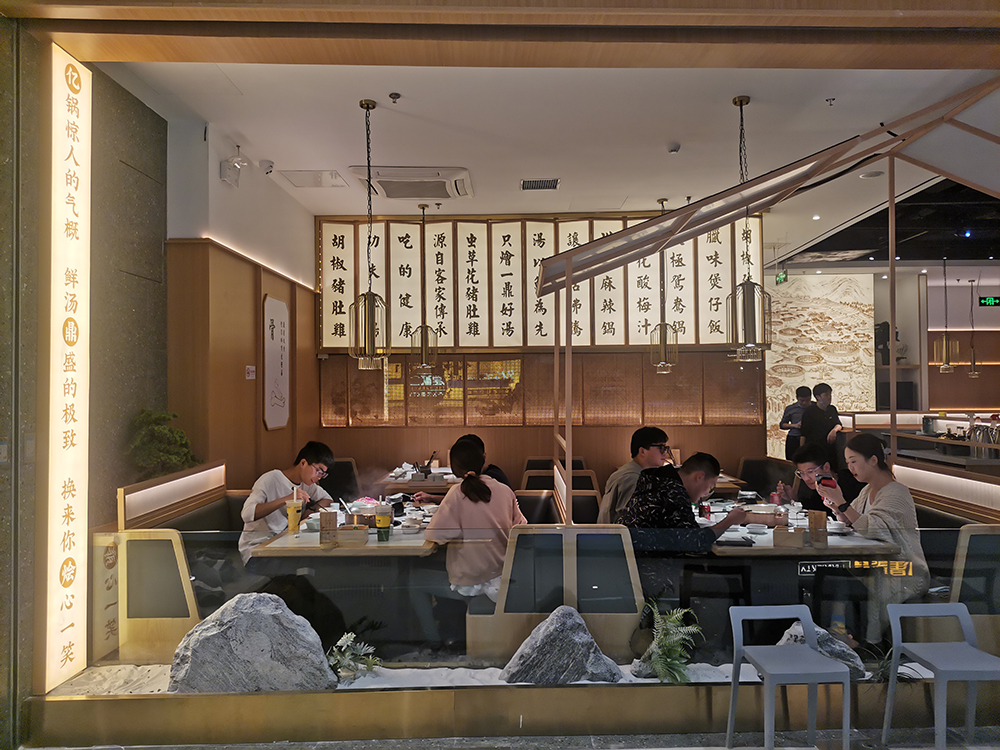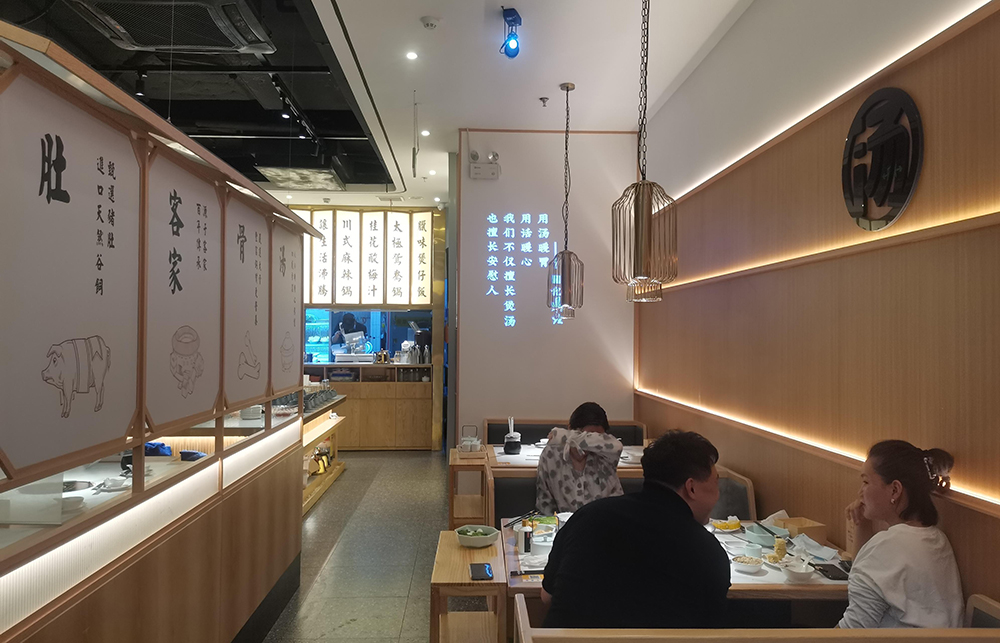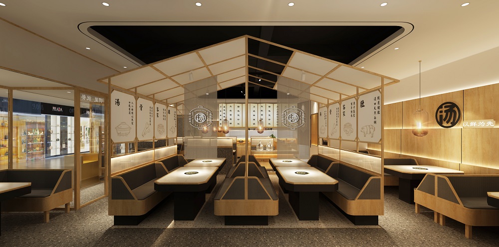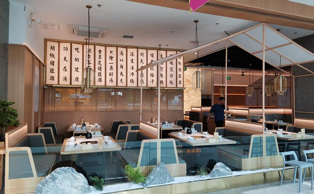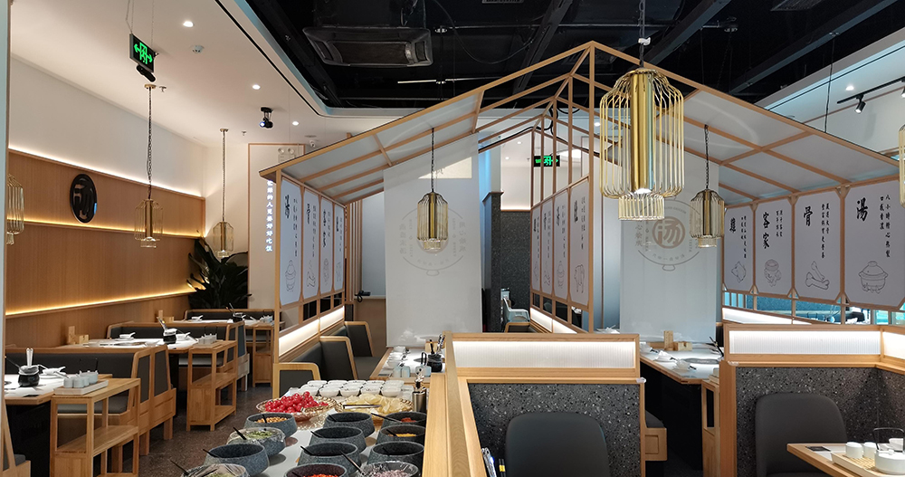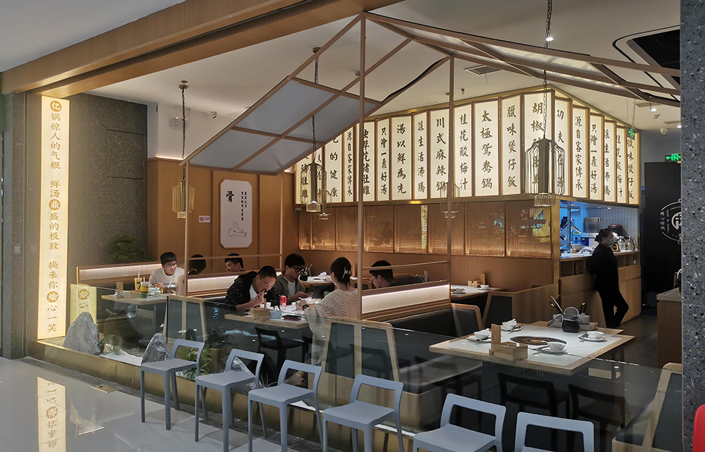 清润温补的火锅品类中,“清新、健康、自然”的猪肚鸡火锅首屈一指,源于清朝宫庭内盛行,已有百年历史,它凭借温润浓郁的汤汁,自然养生,备受青睐,亿鼎烩猪肚鸡火锅作为有十几家店的连锁火锅品牌,本案为地处松江新城的第一家老店的升级改造店,肩负旗舰和形象店,设计师希望融入传统但又不止于传统,现代手法全新打造,区别于前几家门店偏日式简约的调性。