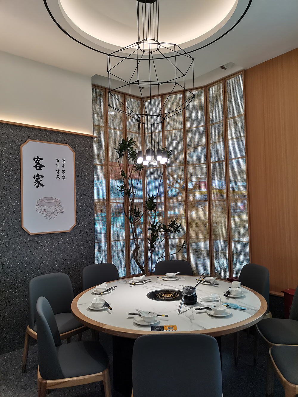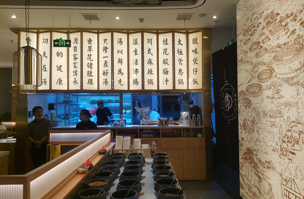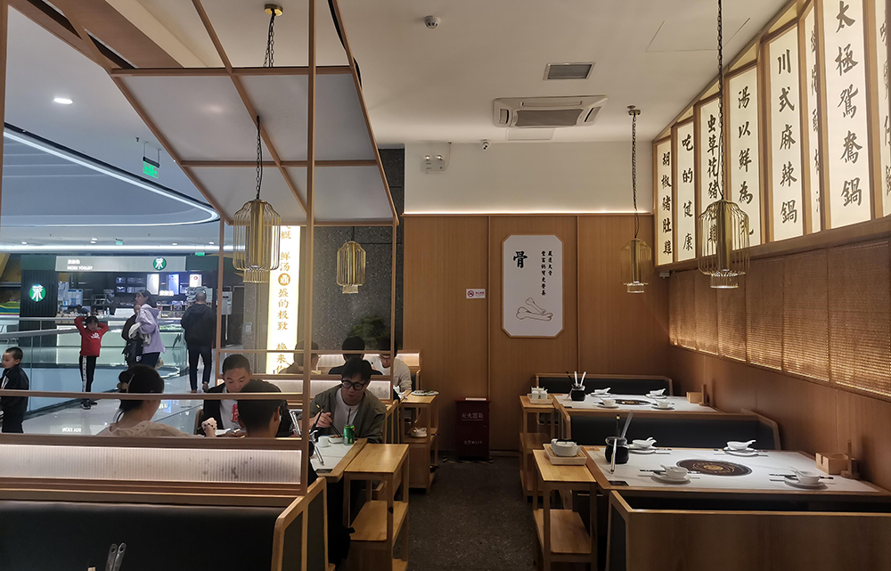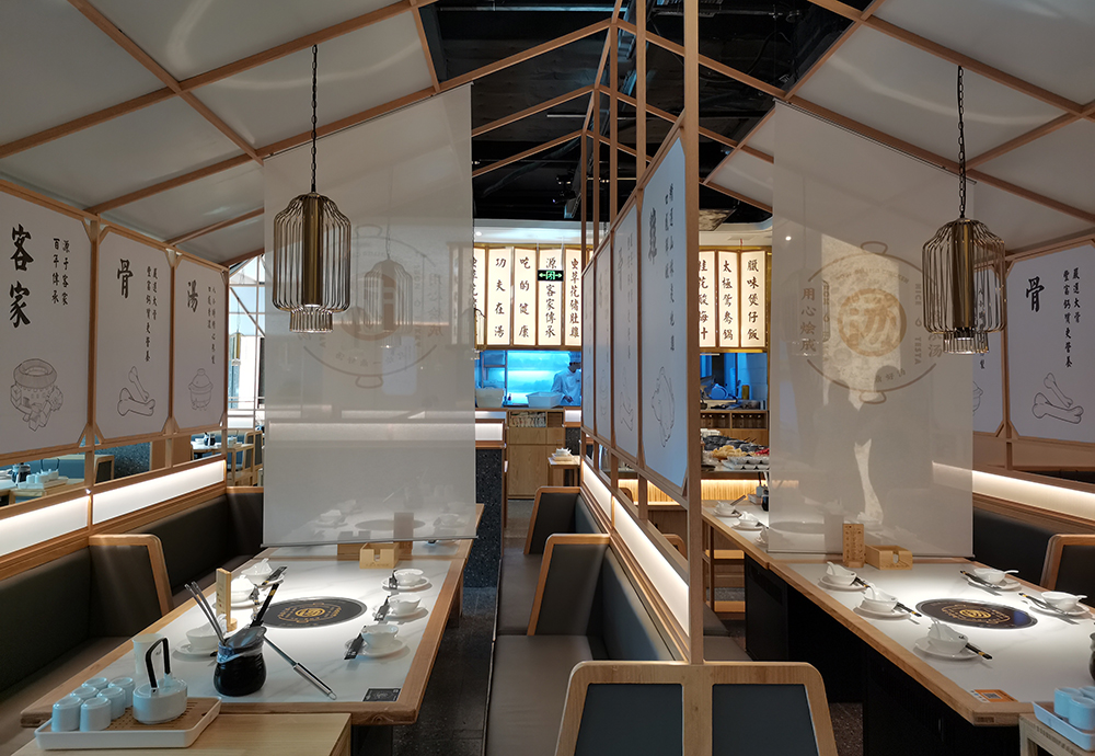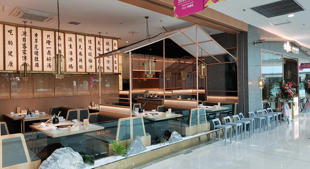 清润温补的火锅品类中,“清新、健康、自然”的猪肚鸡火锅首屈一指,源于清朝宫庭内盛行,已有百年历史,它凭借温润浓郁的汤汁,自然养生,备受青睐,亿鼎烩猪肚鸡火锅作为有十几家店的连锁火锅品牌,本案为地处松江新城的第一家老店的升级改造店,肩负旗舰和形象店,设计师希望融入传统但又不止于传统,现代手法全新打造,区别于前几家门店偏日式简约的调性。