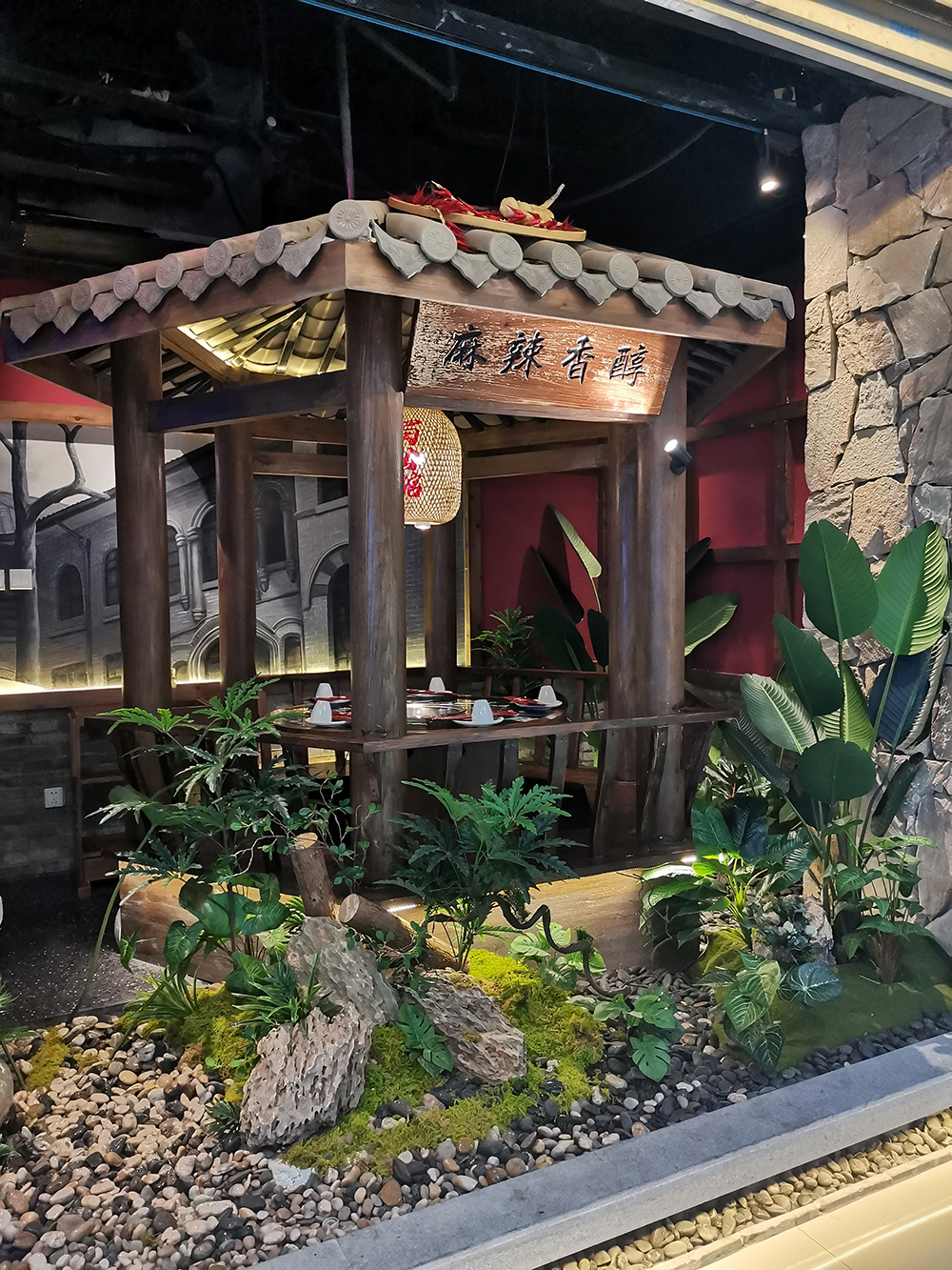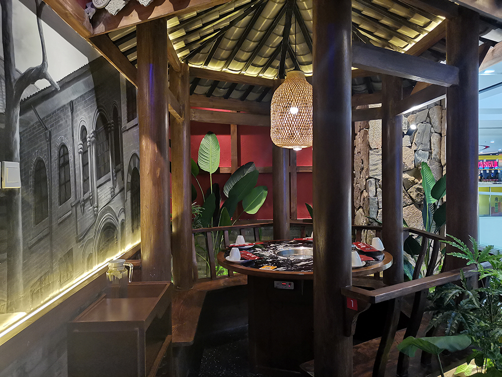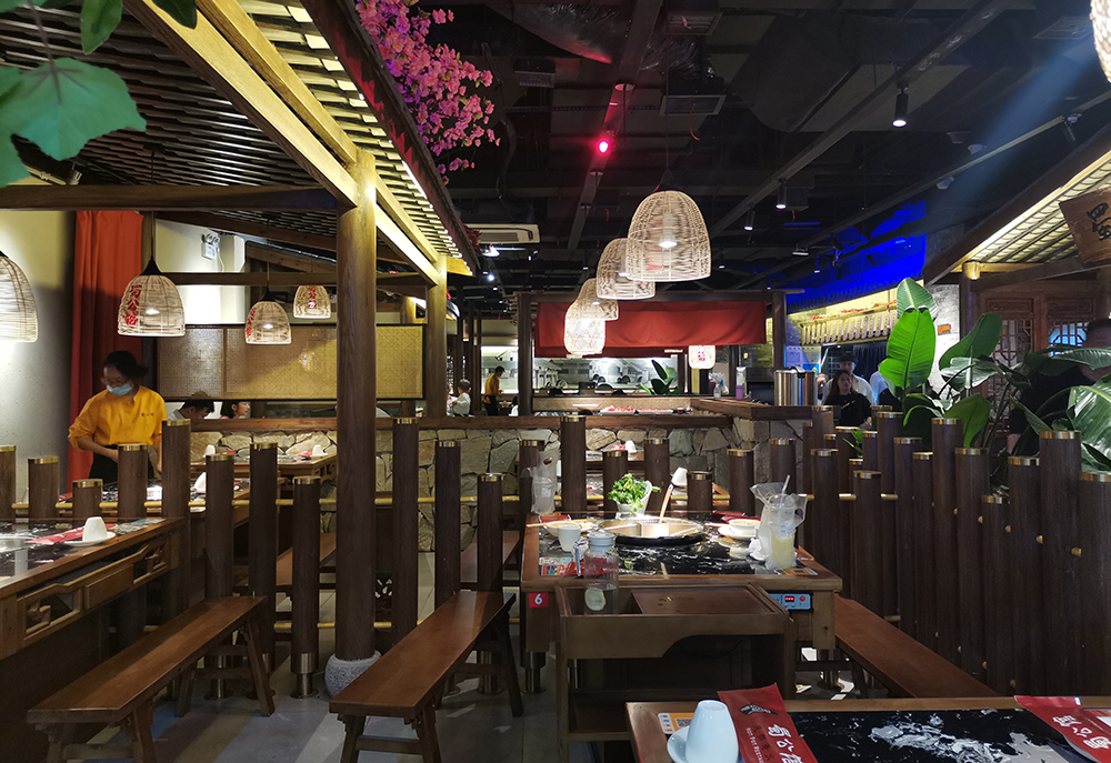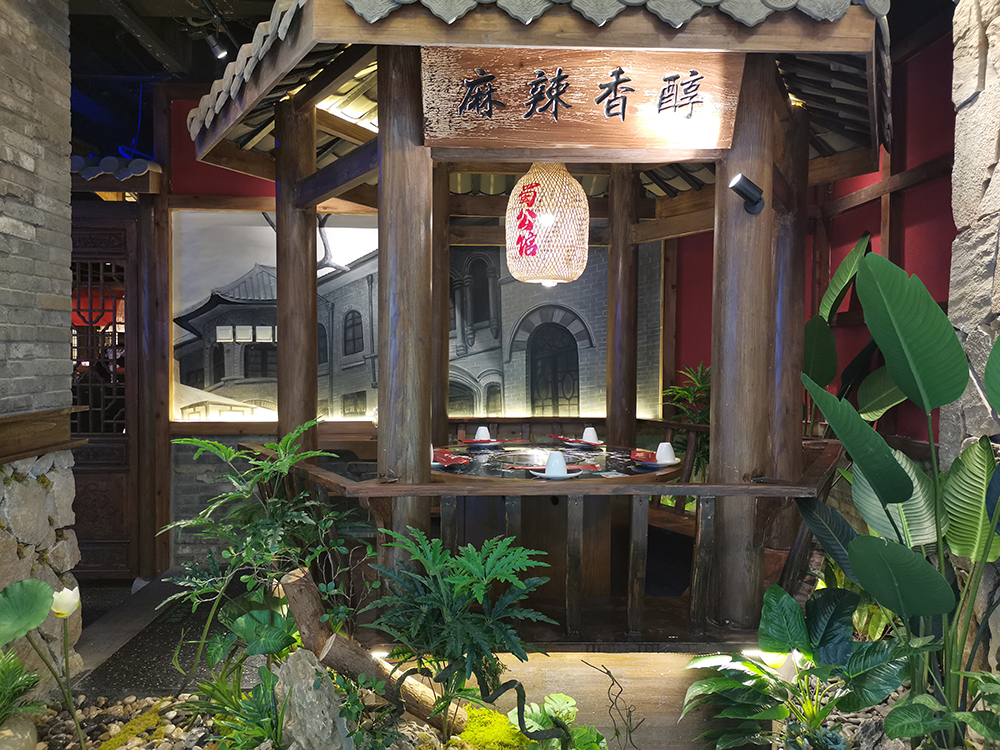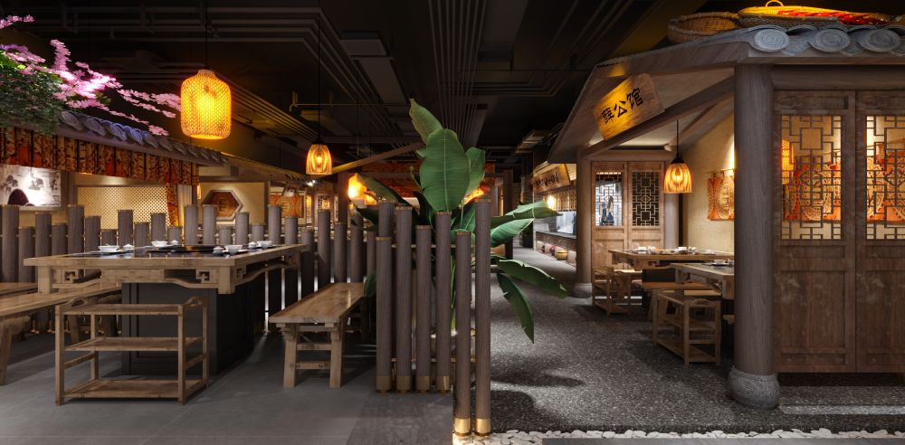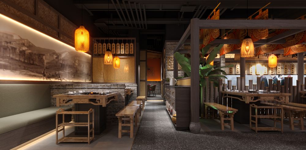 为了更好的增添川蜀文化的厚重,大量采用川西部落建筑构件及木色和瓦档元素,采用青色水磨石地砖来增添几许粗犷之美,隔断的设计用木桩的形式高低错落,藤丝缠绕,也力求还原四川火锅店的真实场景