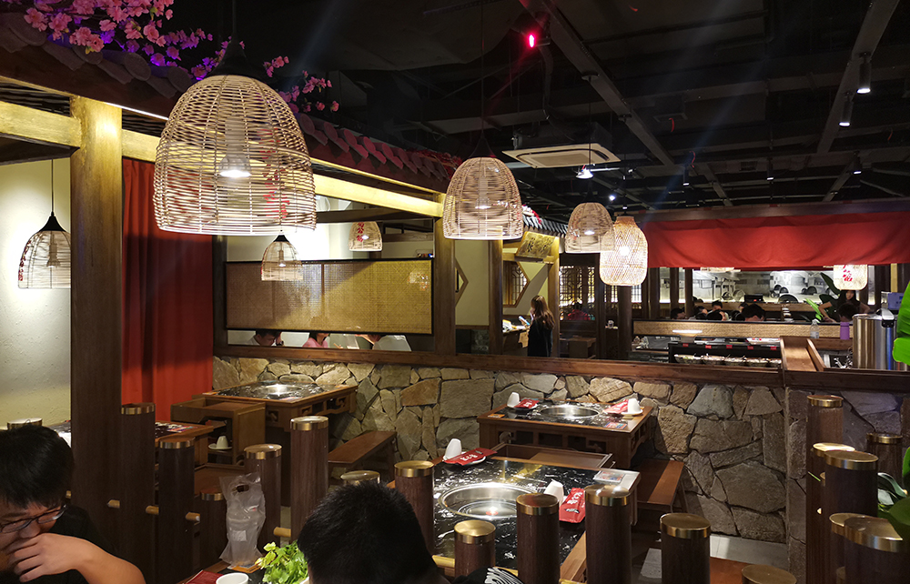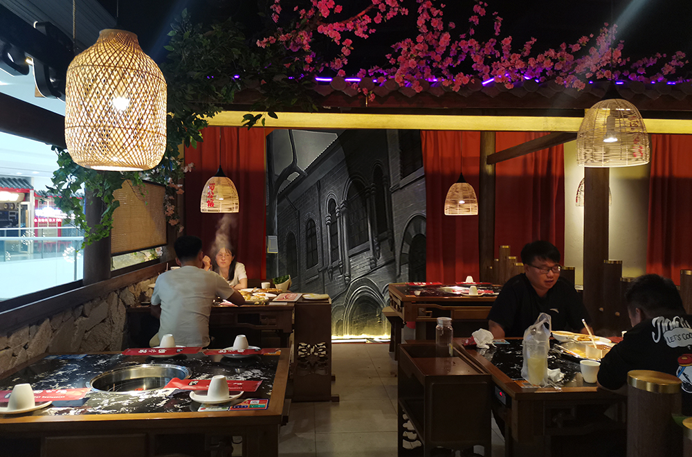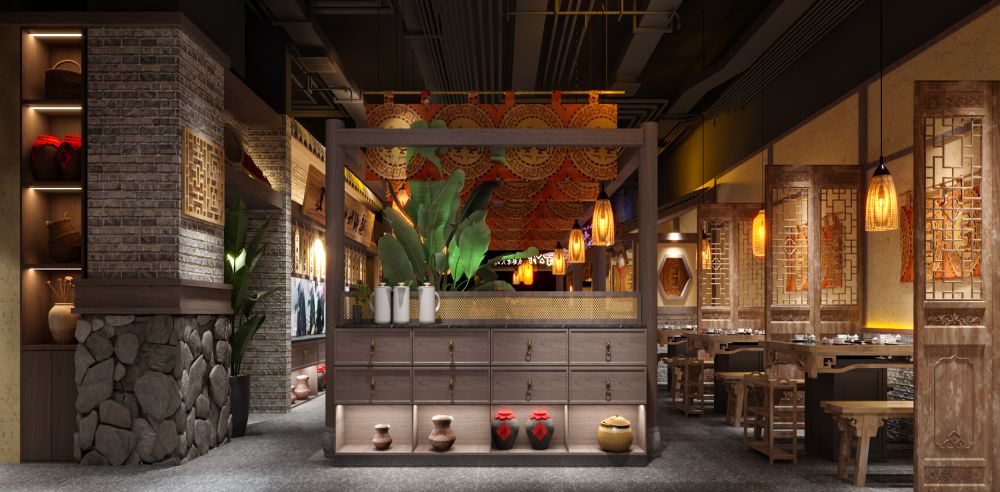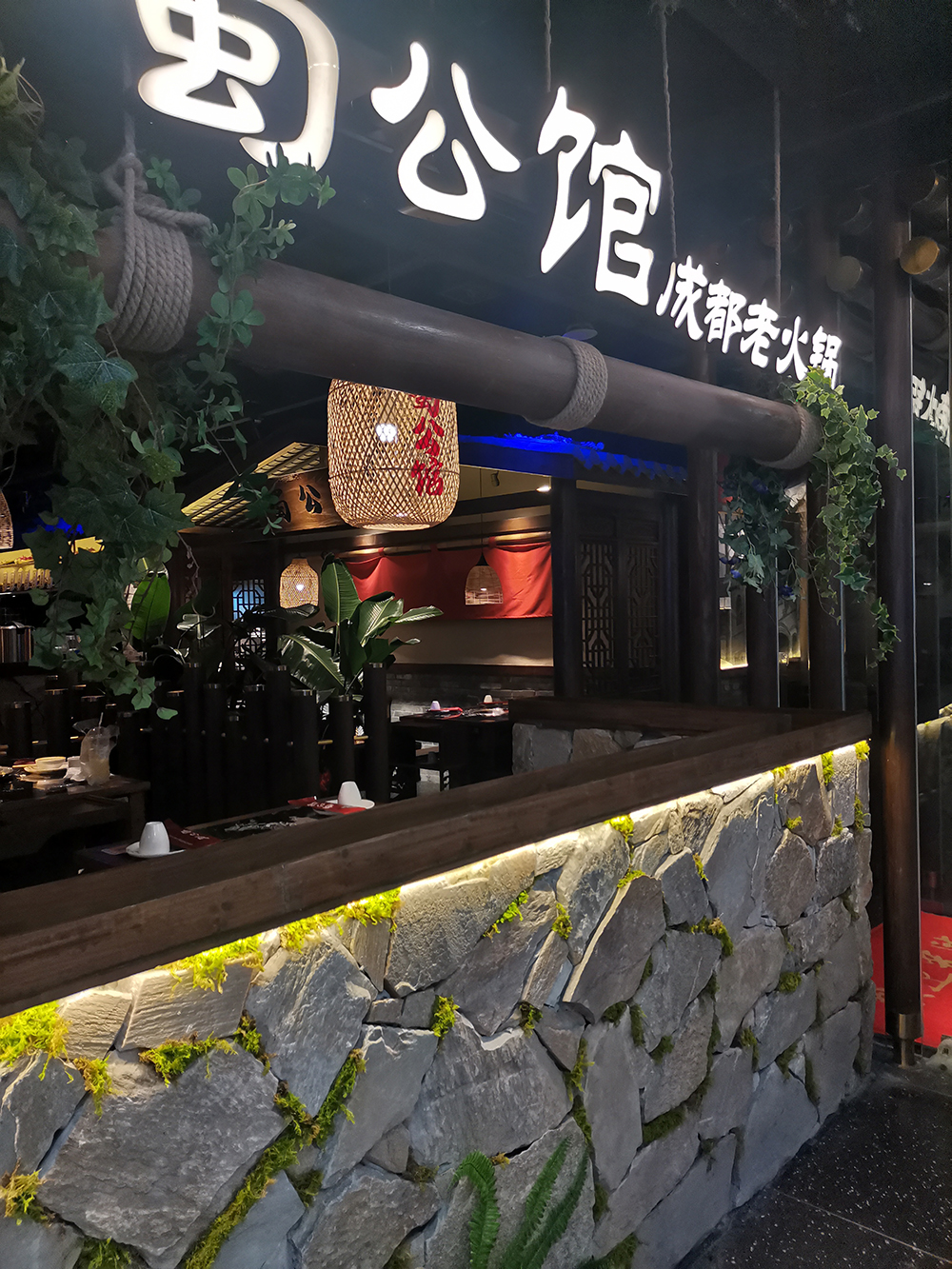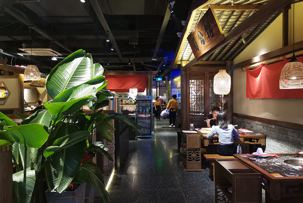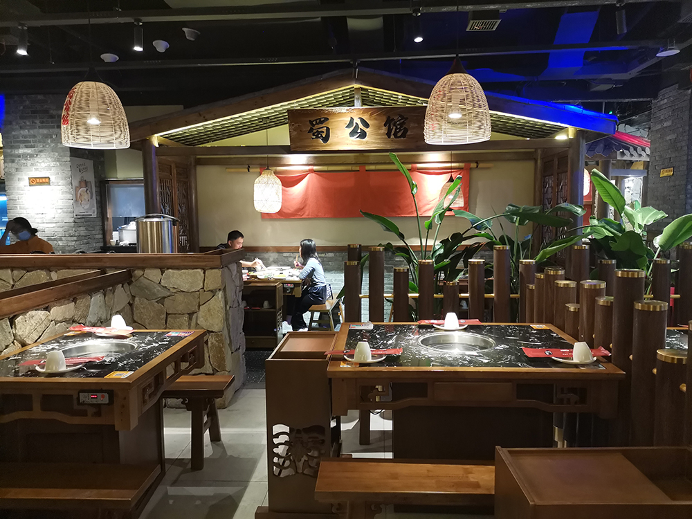 为了更好的增添川蜀文化的厚重,大量采用川西部落建筑构件及木色和瓦档元素,采用青色水磨石地砖来增添几许粗犷之美,隔断的设计用木桩的形式高低错落,藤丝缠绕,也力求还原四川火锅店的真实场景