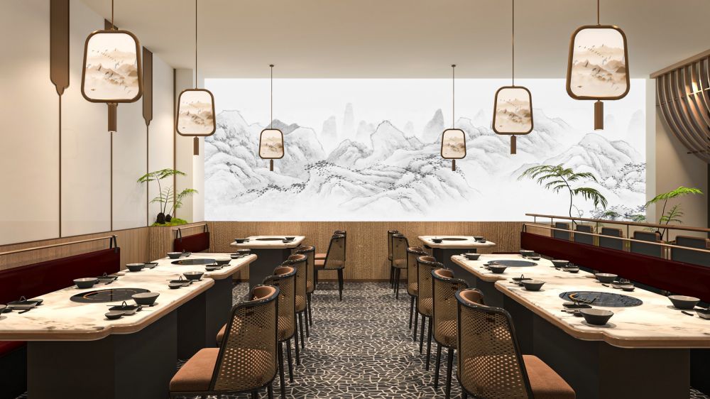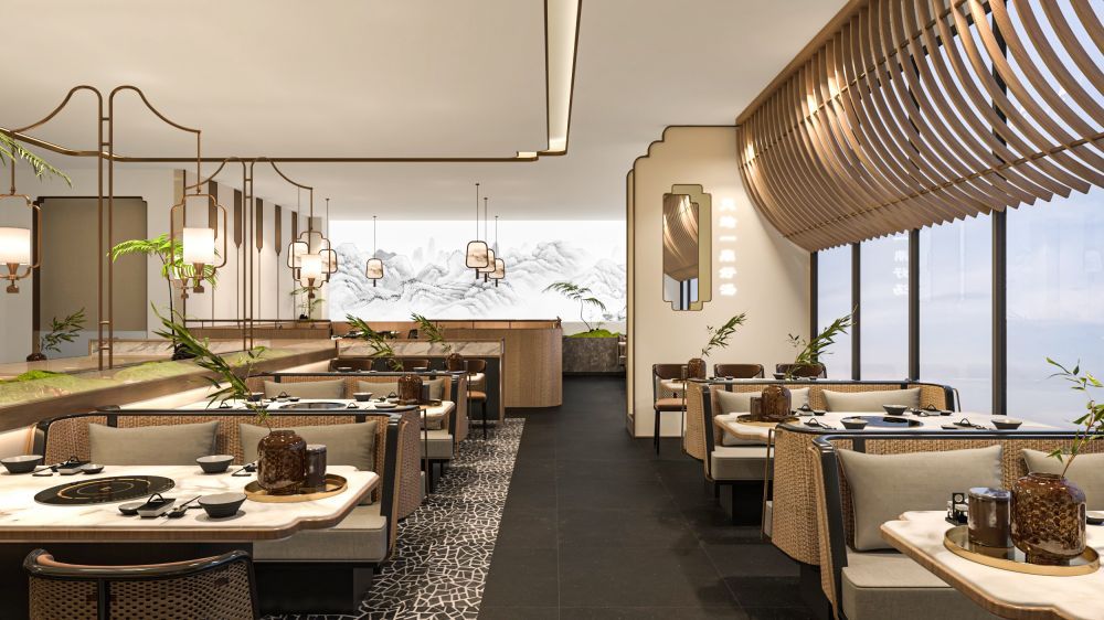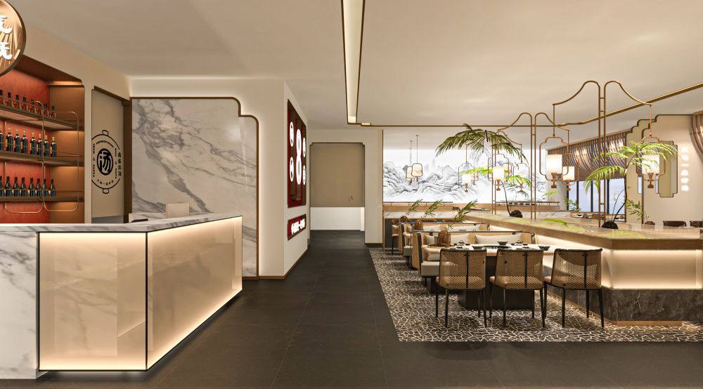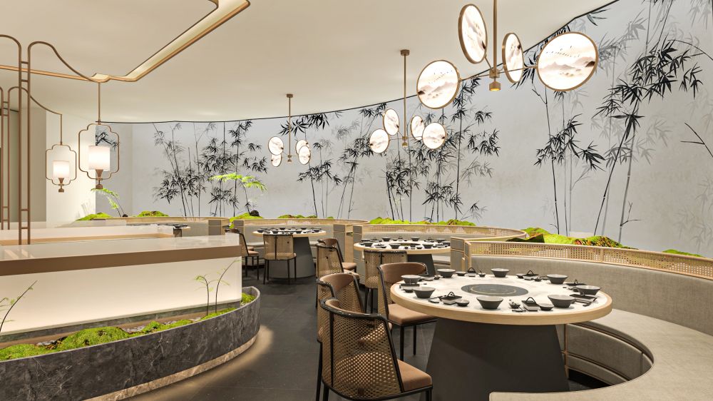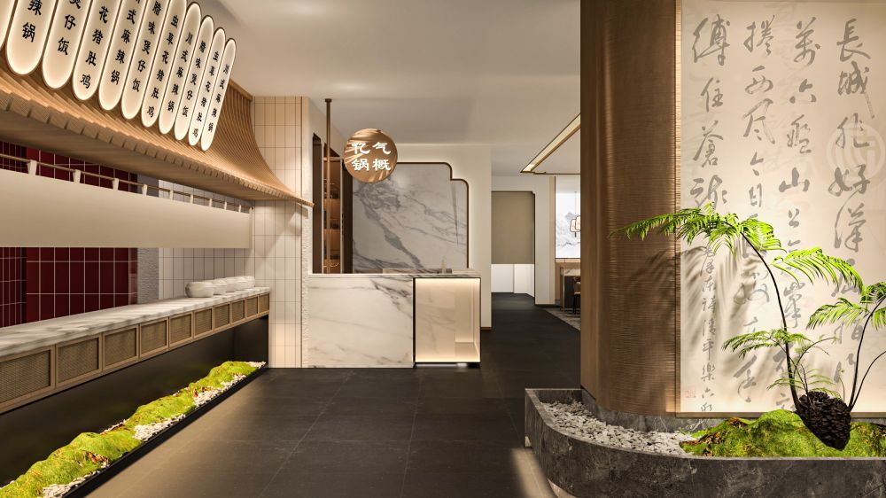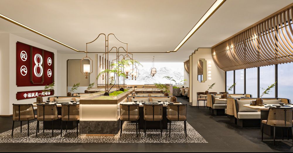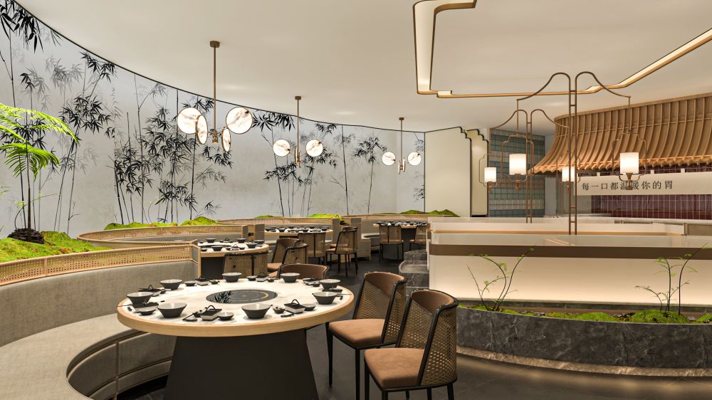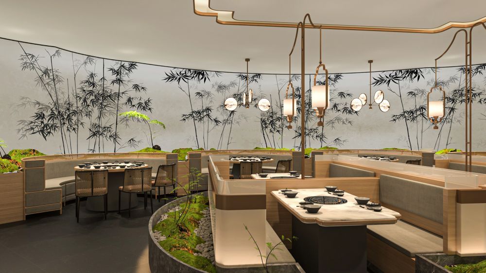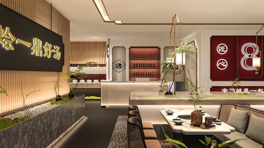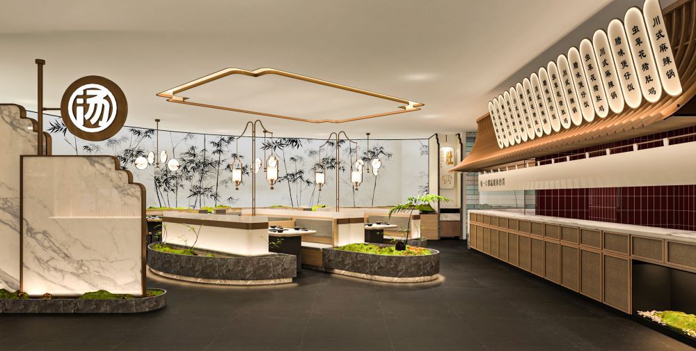 清润温补的火锅品类中,“清新、健康、自然”的猪肚鸡火锅首屈一指,源于清朝宫庭内盛行,已有百年历史,它凭借温润浓郁的汤汁,自然养生,备受青睐,亿鼎烩猪肚鸡火锅作为有十几家店的连锁火锅品牌,本案为地处松江新城的第一家老店的升级改造店,肩负旗舰和形象店,设计师希望融入传统但又不止于传统,现代手法全新打造,区别于前几家门店偏日式简约的调性。
