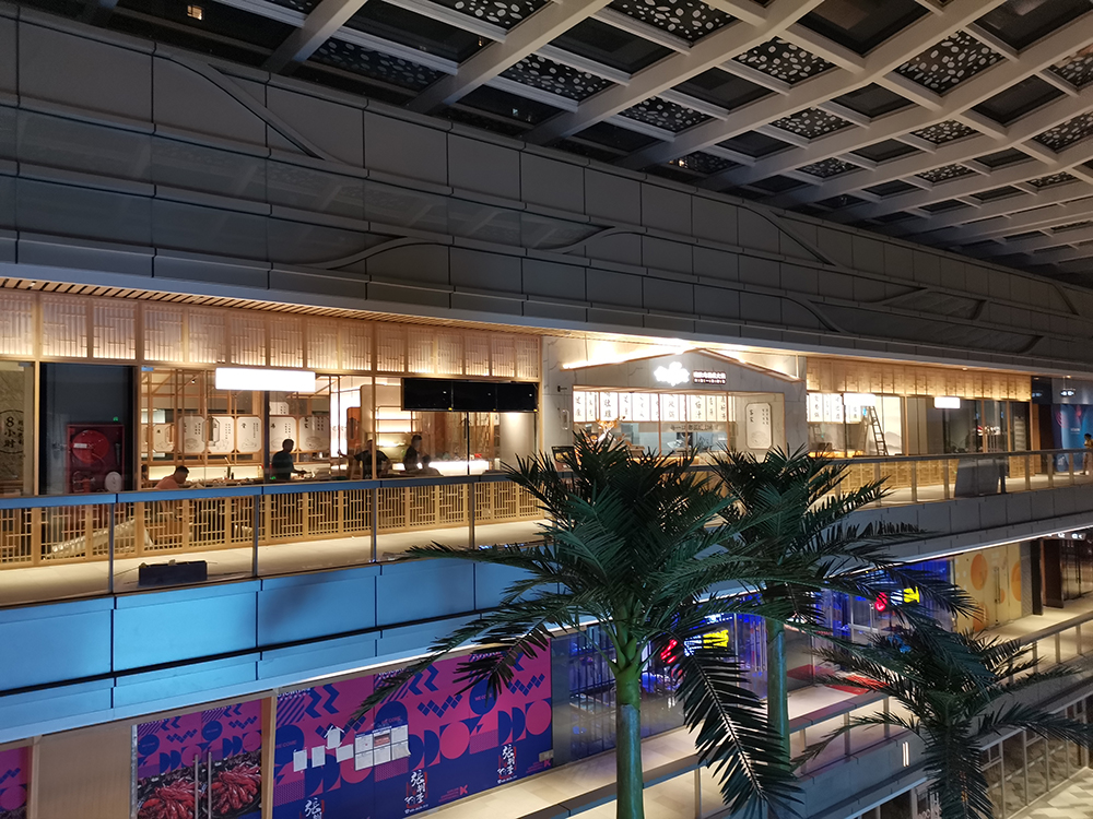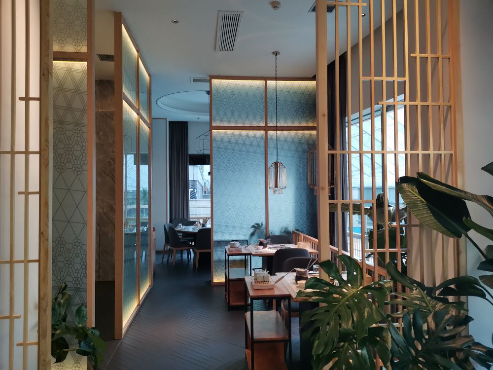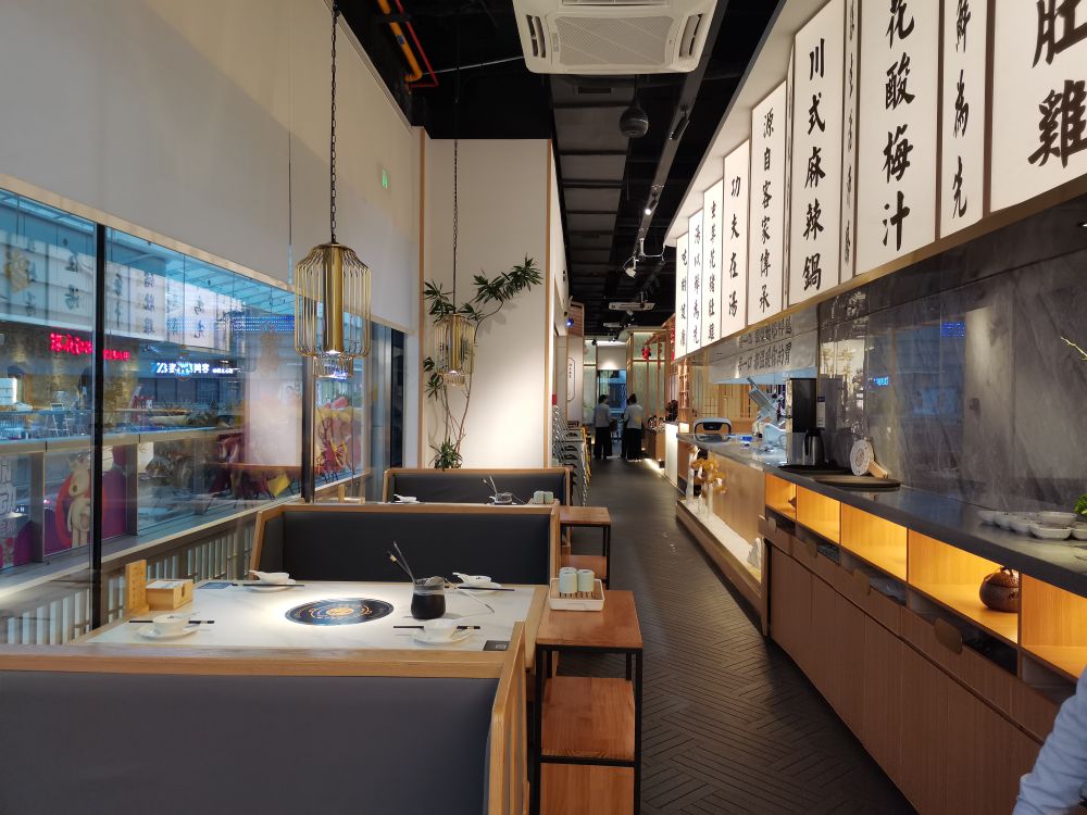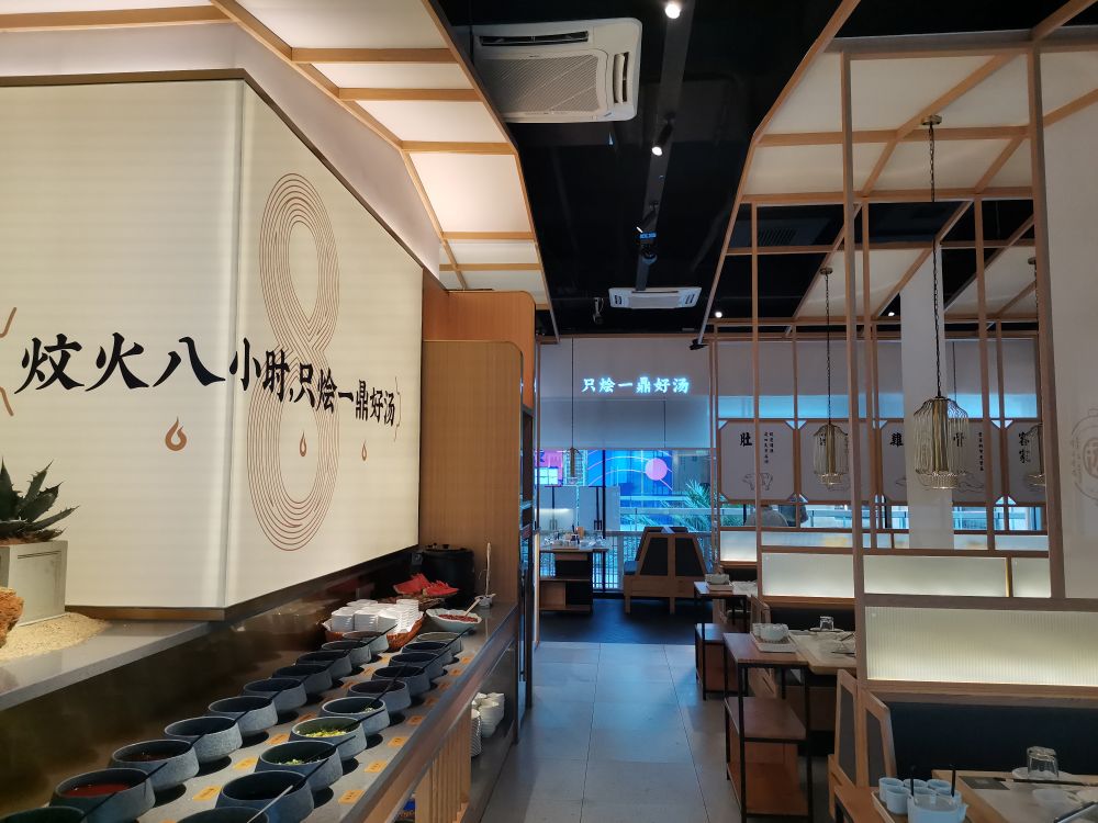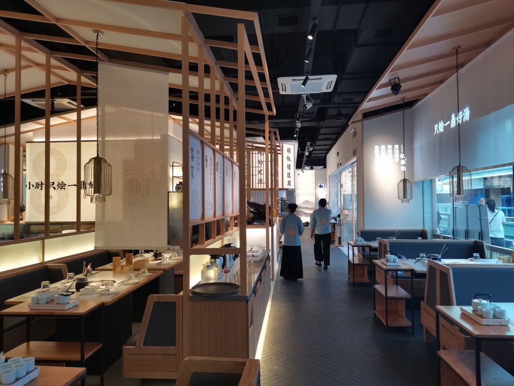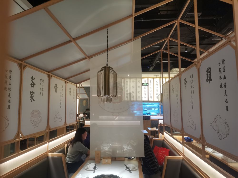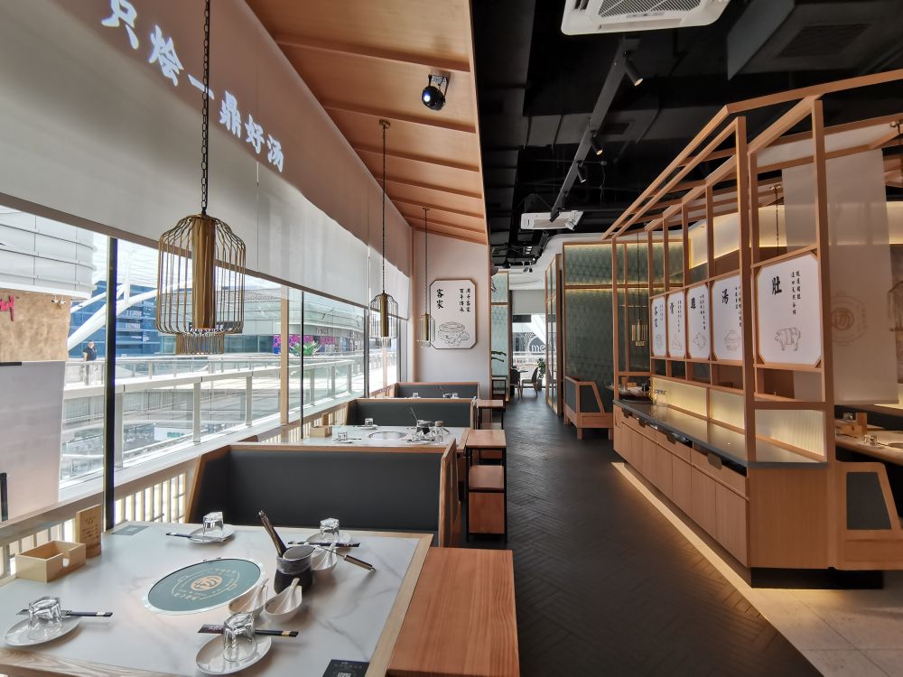 在空间体验上,引用客家庭院斜顶运用当代化的设计语言将空间错落交叠出层次感丰富,使得用餐区在布 局上有了装饰感与秩序性。木色为主的室内质感契合空间气质,廊间营造的行为动线, 将外向内的视觉体验拓展,与日渐均质化的 同类火锅餐饮空间做体验区分,深化其品牌辨识度。