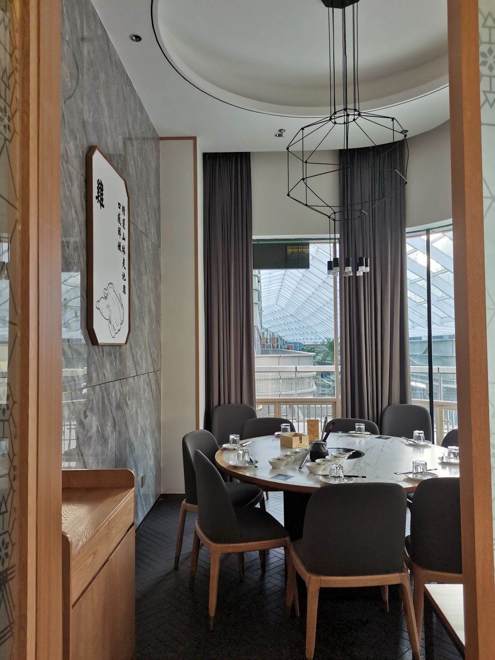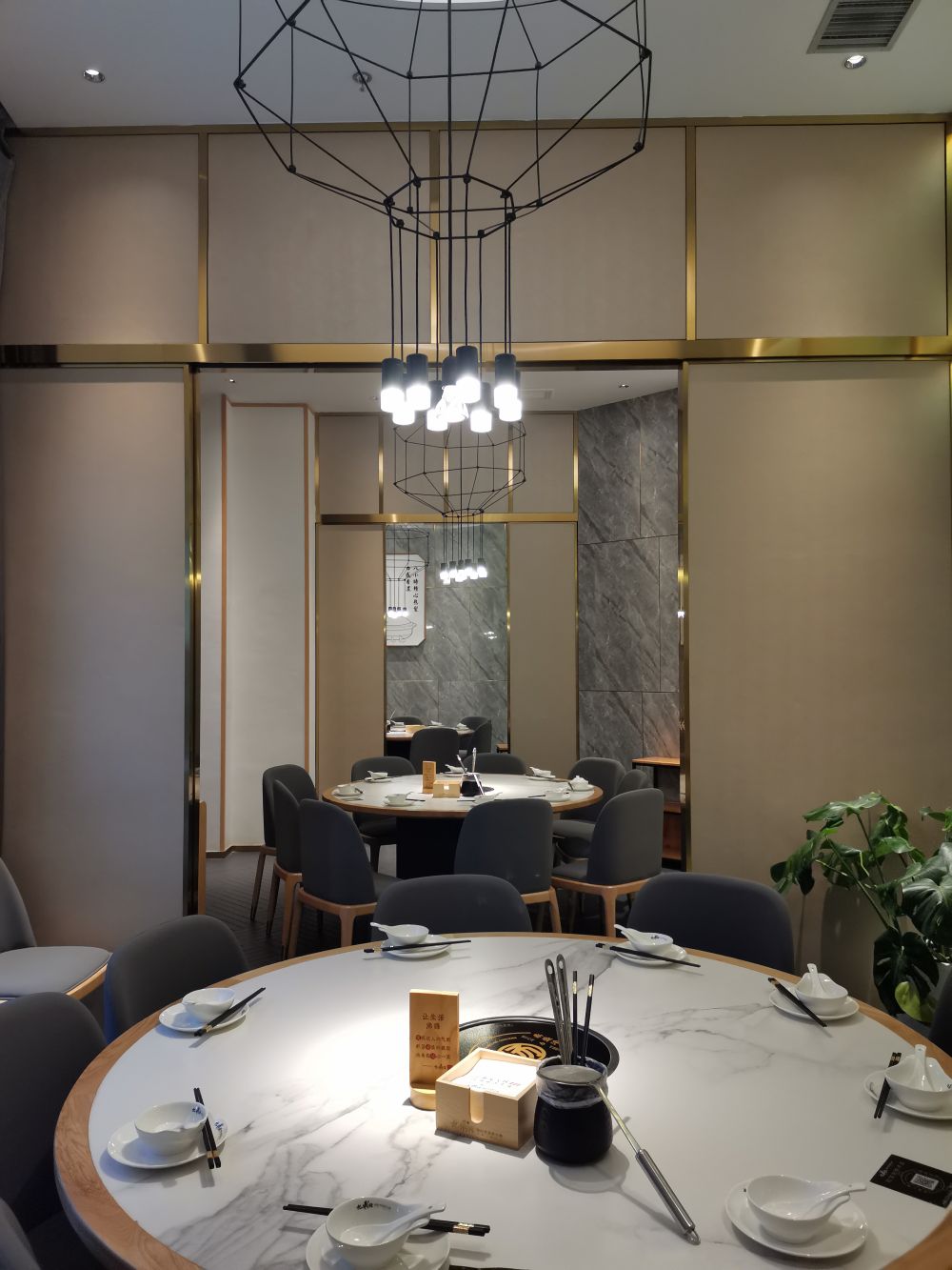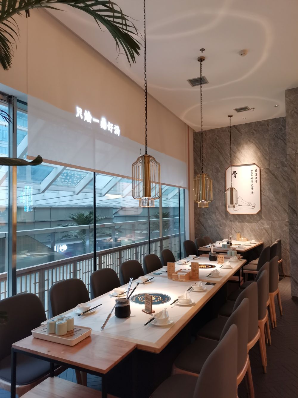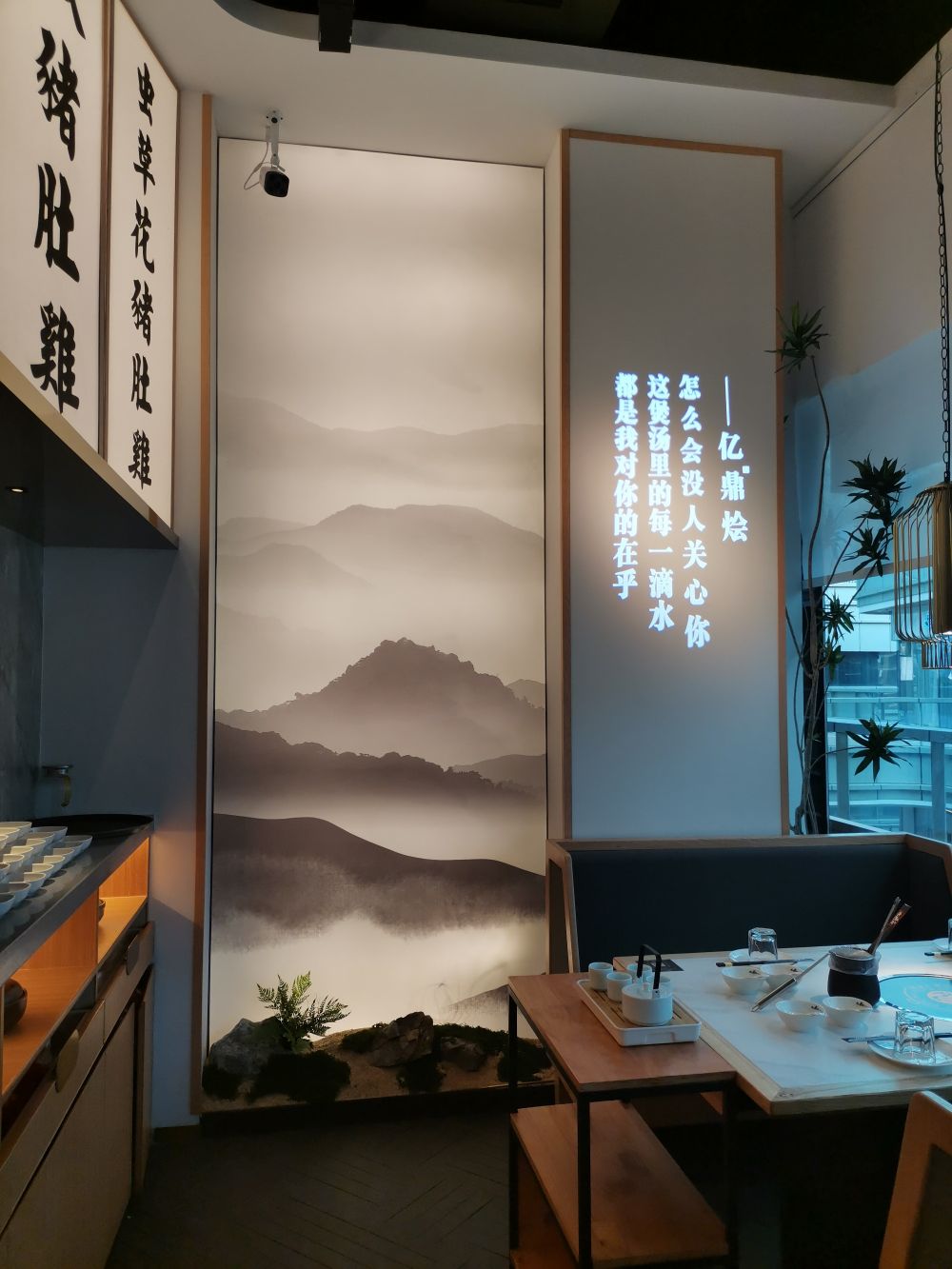 在空间体验上,引用客家庭院斜顶运用当代化的设计语言将空间错落交叠出层次感丰富,使得用餐区在布 局上有了装饰感与秩序性。木色为主的室内质感契合空间气质,廊间营造的行为动线, 将外向内的视觉体验拓展,与日渐均质化的 同类火锅餐饮空间做体验区分,深化其品牌辨识度。