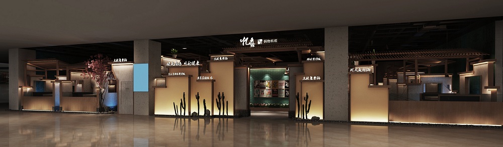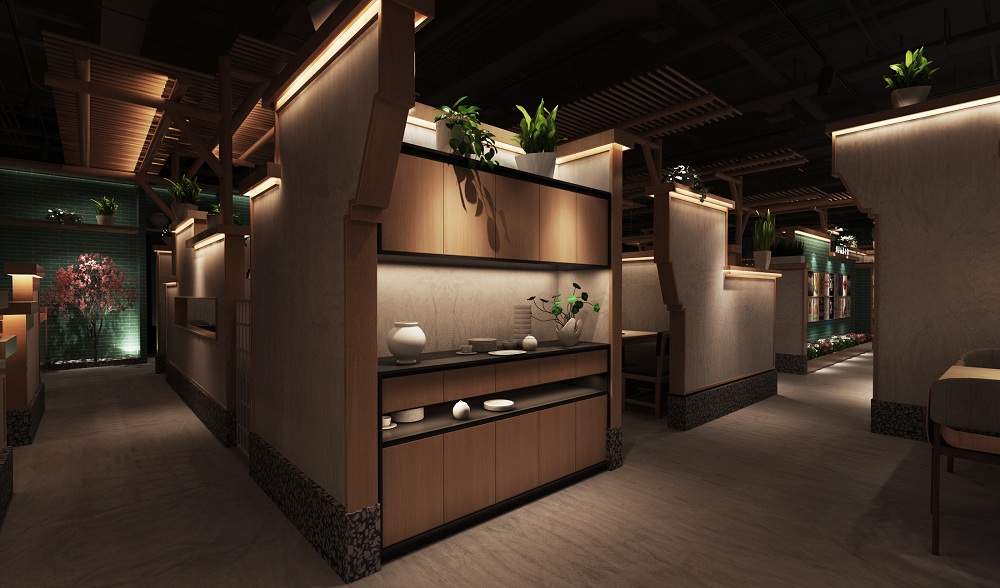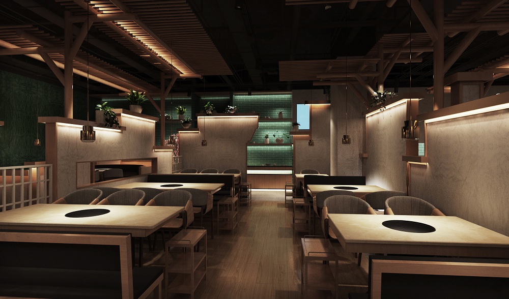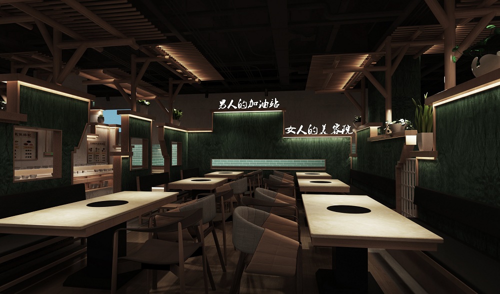 在前期的调研中设计师对猪肚鸡火锅的产品梳理出几个关键词“民间”“广东”“传承”“养生”等属性,我们5DD餐饮设计师结合当下年轻多元的时尚元素,以简洁优雅作为空间定位的基调,营造出惬意舒适的用餐环境。在空间设计上更多的考虑是对于品牌运营,如何在现今激烈的商业环境中快速模块化、数据化更新的理解和思考.从品牌形象、视觉设计到空间规划,透过色彩、材质等不同元素的运用,创造出美食与空间的动态链接,用时尚、优雅的设计迎接每一位前来享用美味火锅的食客。