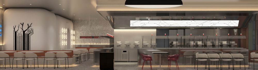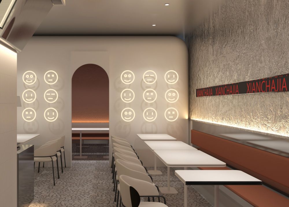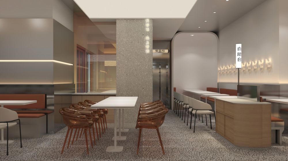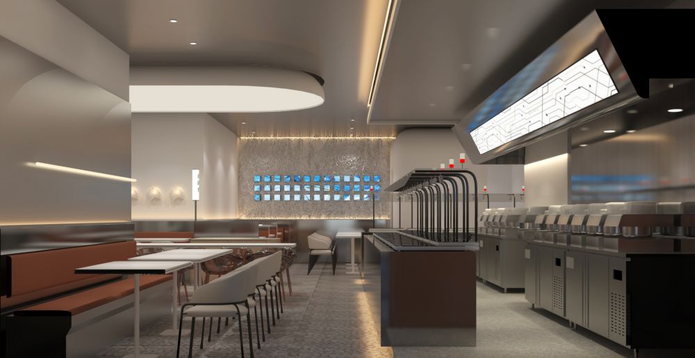 在室内空间上,我们对整体进行自由分割,确保每个空间自由且独立。开放性的选菜和机器人炒菜机一览无余,开放性和自由度的提升,独立不失融洽,冷且极具工业感的不锈钢强化了机器人智慧餐厅的主题,