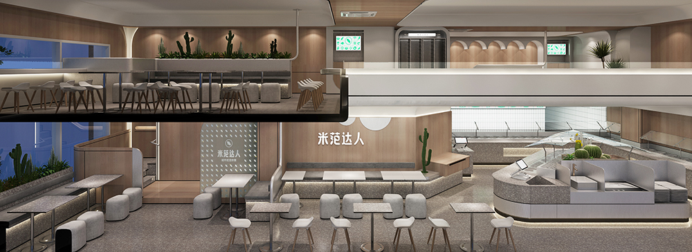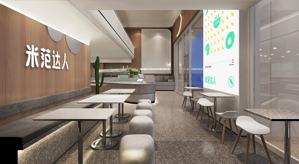 整个门店的设计,以现代简约的设计手法进行构建,色调明亮、清爽;以一粒米为主题,抽象提取米的弧度和曲线,为空间增添了不少活力和趣味性,加强了品牌文化的呈现,提升了米范达人的品牌辨识度和号召力。