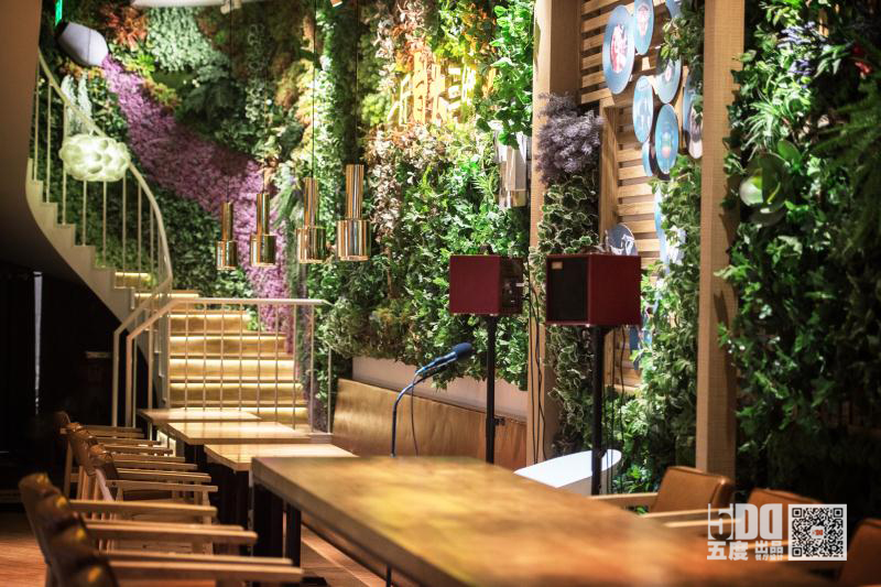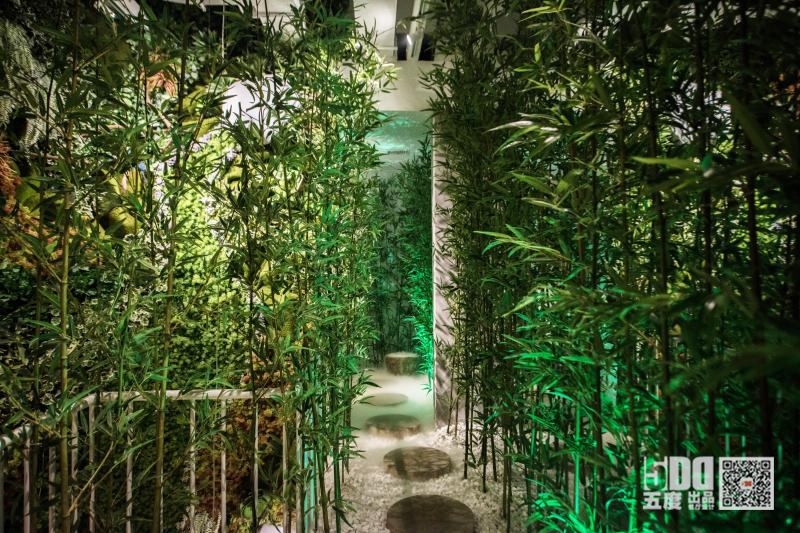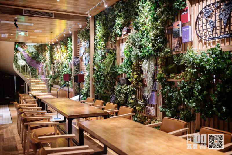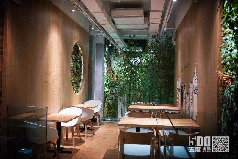 二楼就餐区和卫生间中间布满了一片绿森林,在钢筋森林的城市中顿感亲切,打造一个可以自由呼吸、放松的自我空间。