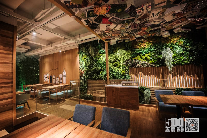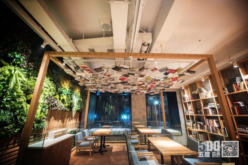 植物景观、光影等放大视觉的延展,并在空间中利用自然材质和温暖木色调,达到整体而又有对比的效果。二楼特别设计了个空中楼阁,配上整排6米高的书架,以及吊顶上满天星似的书本,让人忙里偷闲,坐下来好好发个呆,坐在空中阁楼中,透过整片布满熏衣草的窗台,或许一天的疲惫由此解脱。