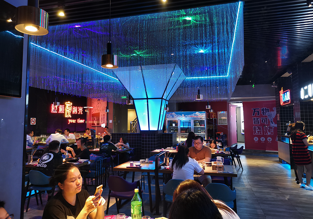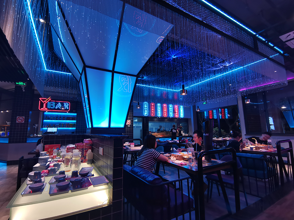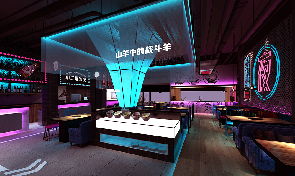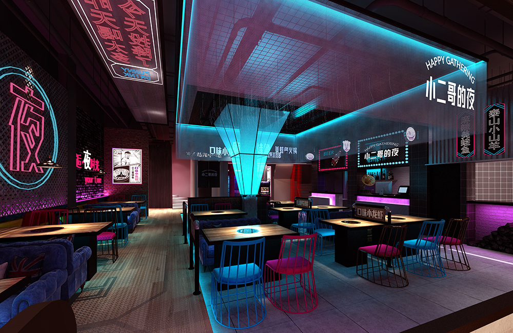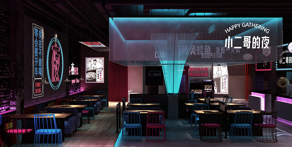 欢乐的道具,比如音乐丶霓虹丶光纤 丶金属丶红砖,增加顾客轻松体验。