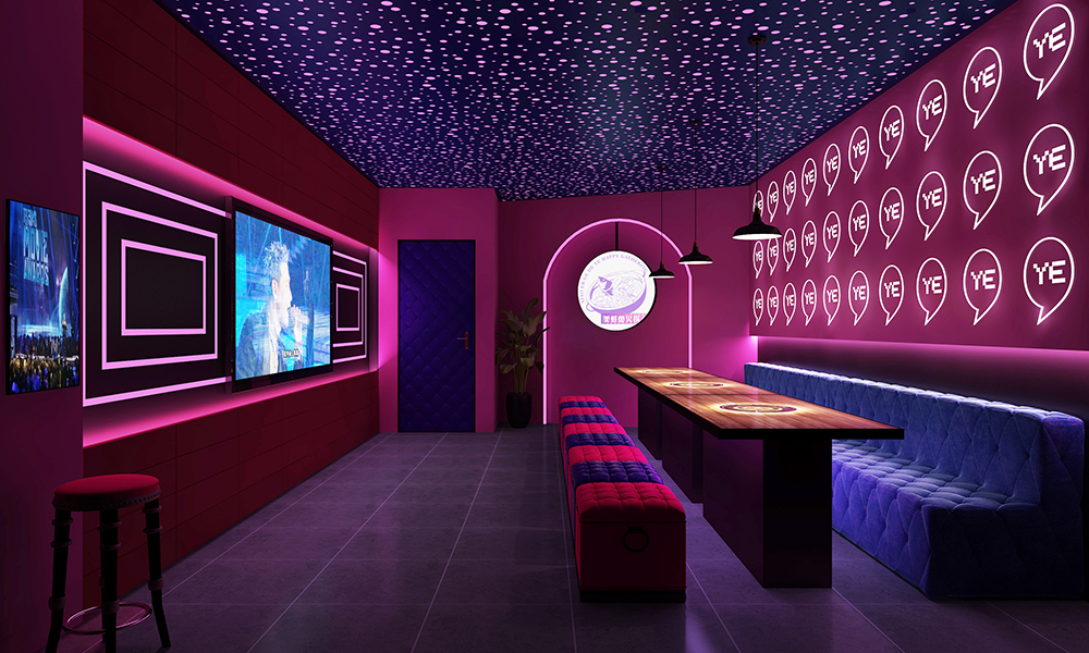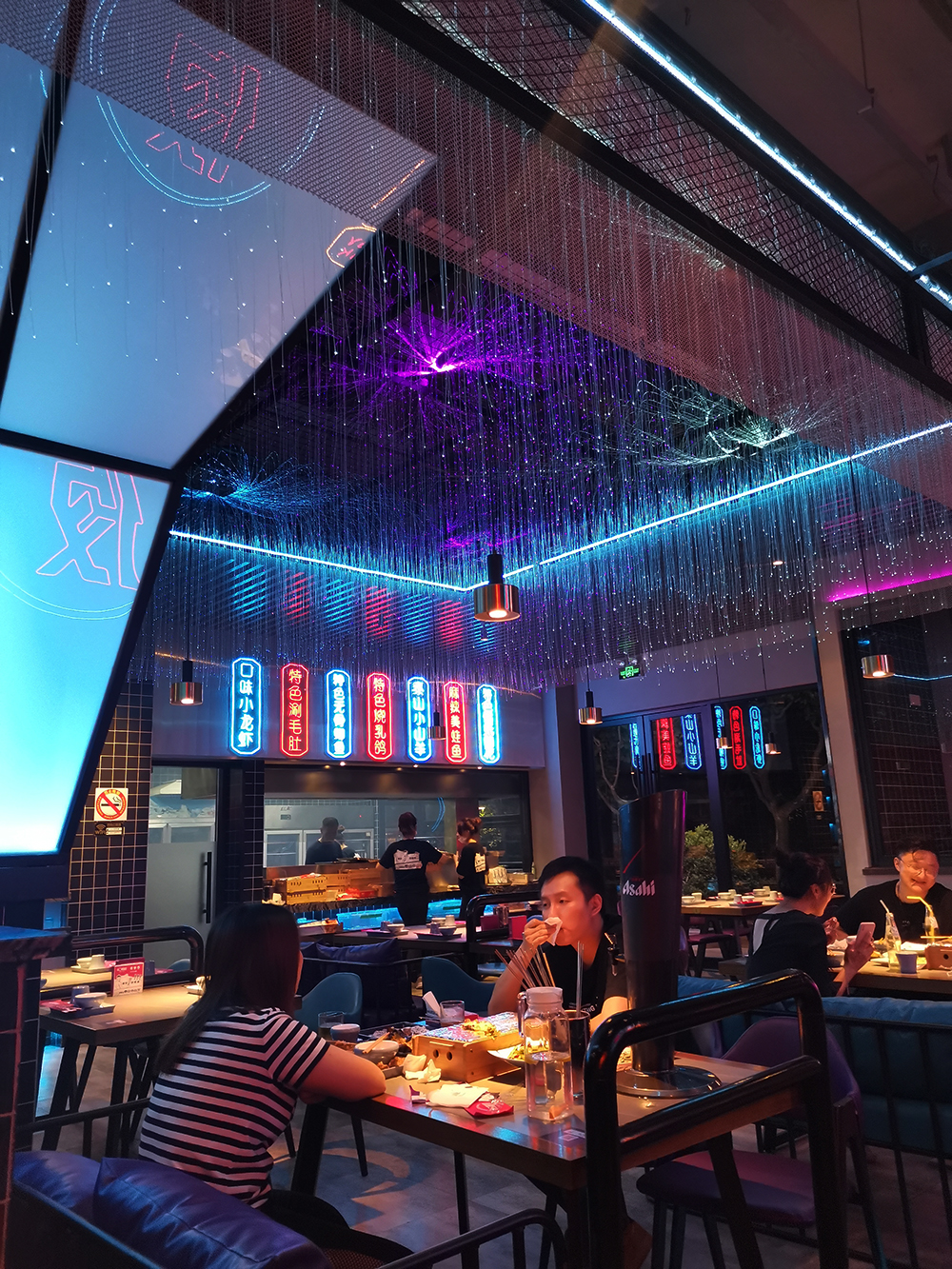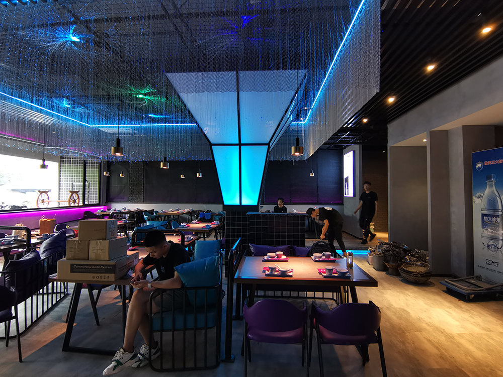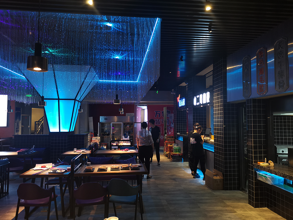 欢乐的道具,比如音乐丶霓虹丶光纤 丶金属丶红砖,增加顾客轻松体验。