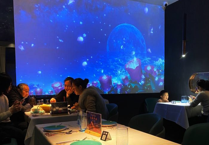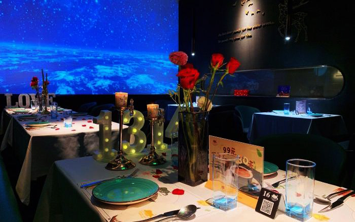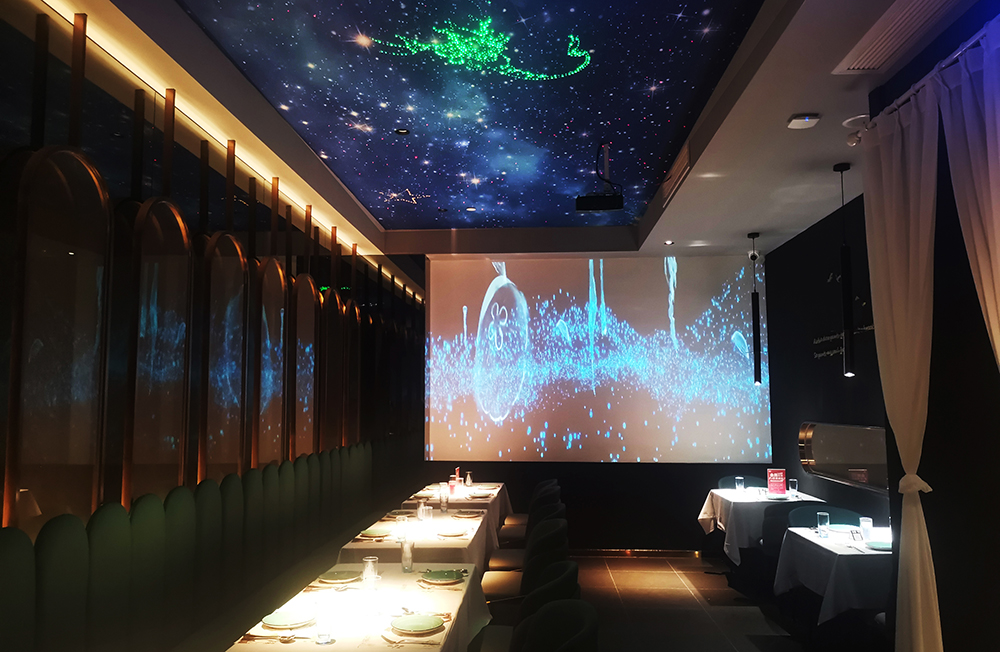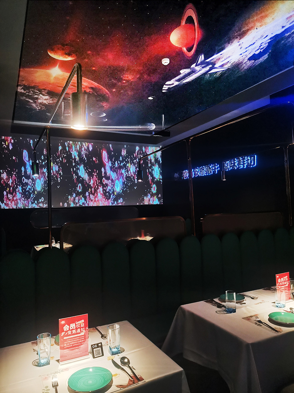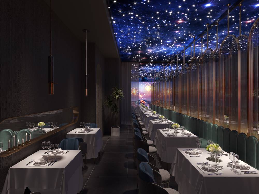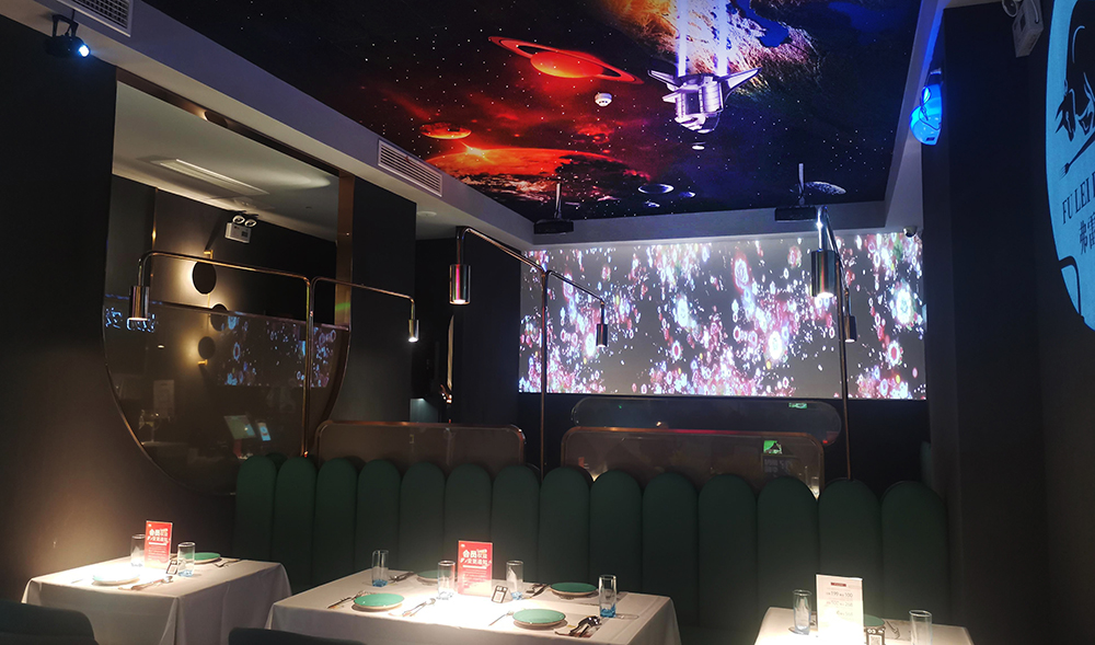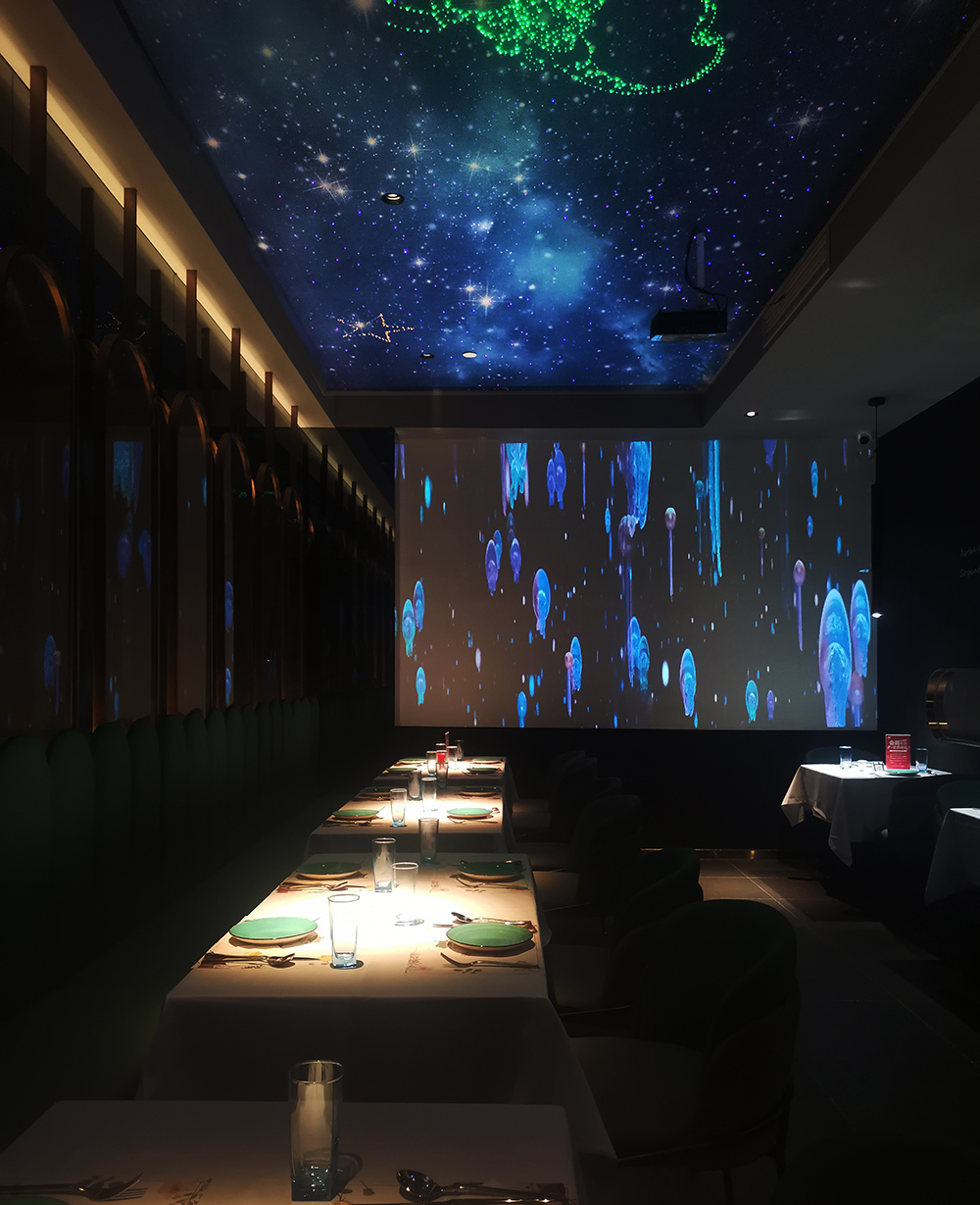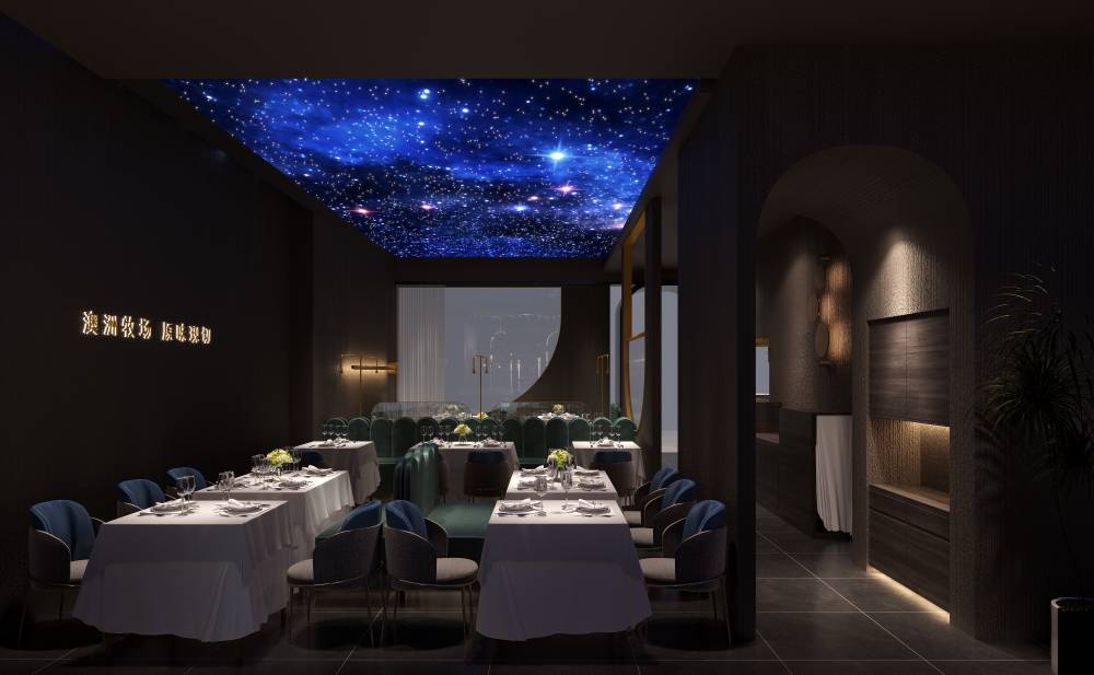 地面是深色亚光砖石拼贴,半透明的隔断屏风若隐若现,为整体深色调的环境增添的神秘性,为了打破暗黑空间的压抑感,设计师在顶面设计了光影幕,深邃的宇宙蓝光打破了这个沉闷。