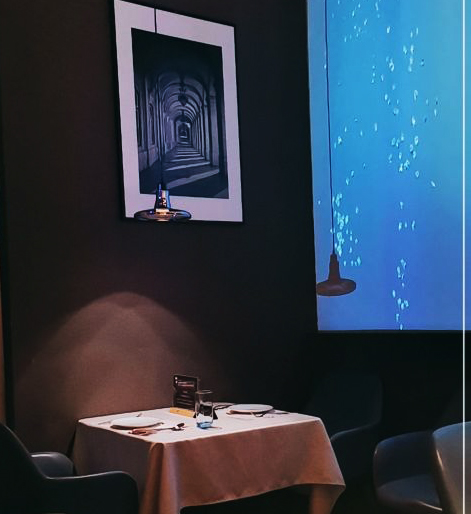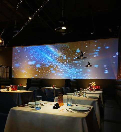 设计师巧妙的将空间分割成几个区域, 靠近门口的开放区和服务以成人情侣为主的私密区,动静分离。地面是深色亚光砖石拼贴,半透明的隔断屏风若隐若现,为整体深色调的环境增添的神秘性,为了打破暗黑空间的压抑感,设计师在顶面设计了光影幕,深邃的宇宙蓝光打破了这个沉闷。