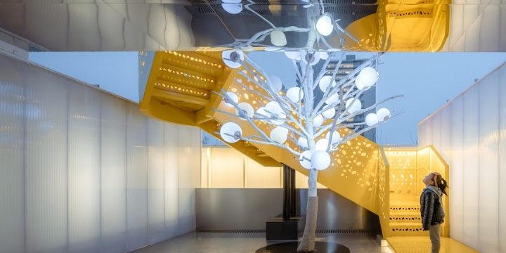 整个餐厅最重要的高潮是屋顶上用双层穿孔铝板建造的红色飞屋。沿着黄色的线索,经过一个不锈钢的水面,绕过泡泡树,曲折走向屋脊,光线越来越亮。这空中的飞屋很容易成为园区一个显而易见的标志,它也可以是灯塔,指出我们生活的局限。