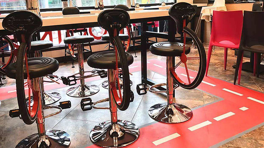 伫立在店外偌大的玻璃窗旁,首先映入眼帘的是别具一格的单车造型,伴随着悬浮的云朵造型,仿佛传递着轻快骑行的无限乐趣。鲜明灿烂的橙色元素使店里充满了夏日的活力气息,两面主题墙的设计赫然在目,从单车部件到摩拜影像的立体画布,尽显摩登上海的海派特色,“让自行车回归城市”的骑行理念跃然其中传递出人们骑行穿梭城市,畅享美食的生活态度。
