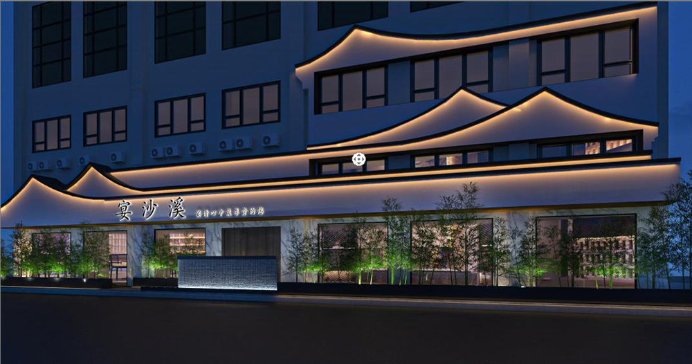 餐厅门头引自江南屋檐俏角造型,层层叠叠,延绵不断结合灯光的融入增加了现代意味,