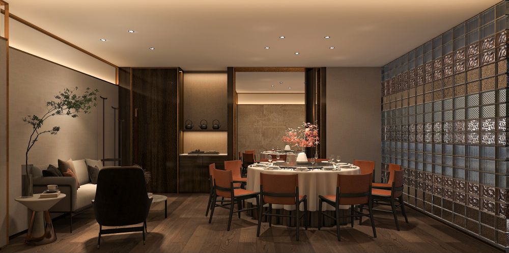 设计师用玻璃砖元素围合出几个包间,通过玻璃砖的反射、折射等作用,强化包间内采光的同时延伸距离感,深化虚实感,达到源于物象又超越物象的境界,营造自由而惬意的审美体验。