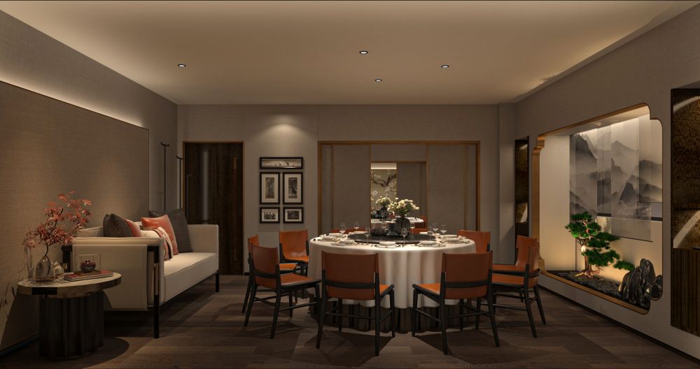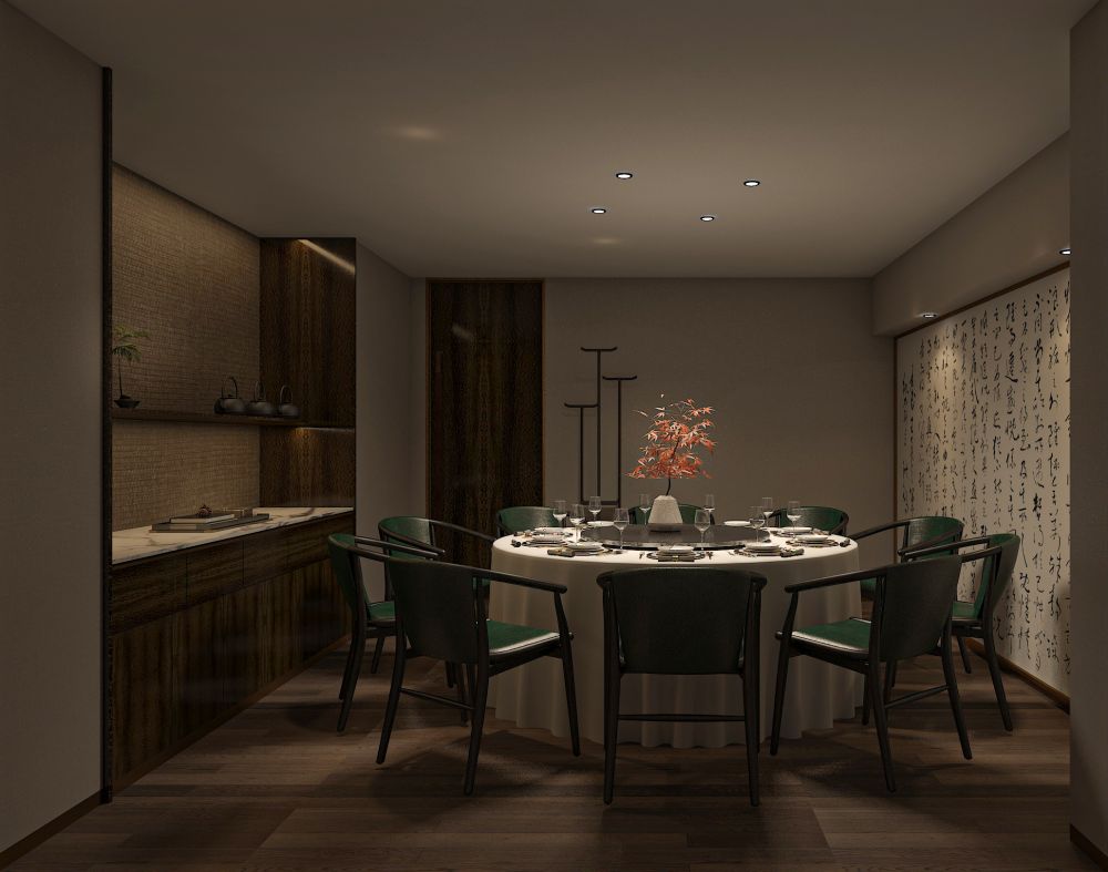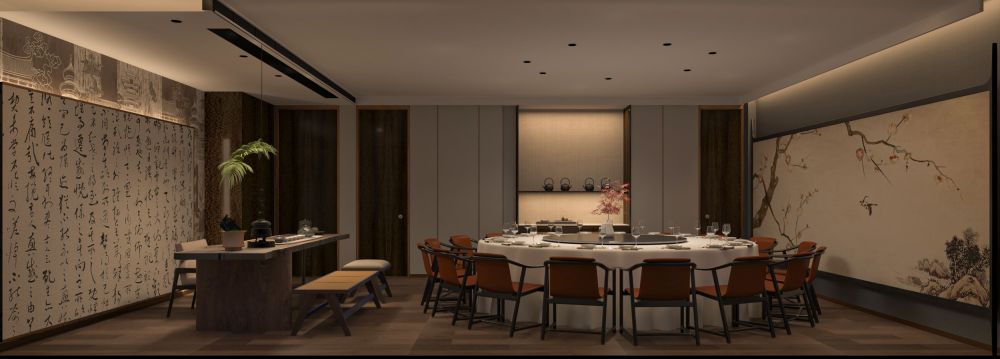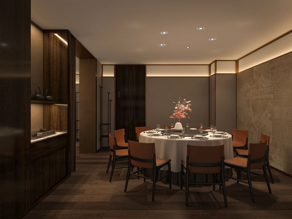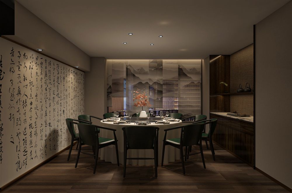 餐厅的定位是为精致高级的苏式菜品牌,包厢占比大。因此,设计师对建筑的内在空间进行了合理化布局,使用深色木饰面结合白色石材,地面用劳伦黑金大砖,把原本不大的前厅,设计成充满江南朦胧韵味的散客区,奠定整个空间的基调与品格,使这里成为顾客的第一道视觉盛宴。结合墙面上的竹、艺术墙布等装饰