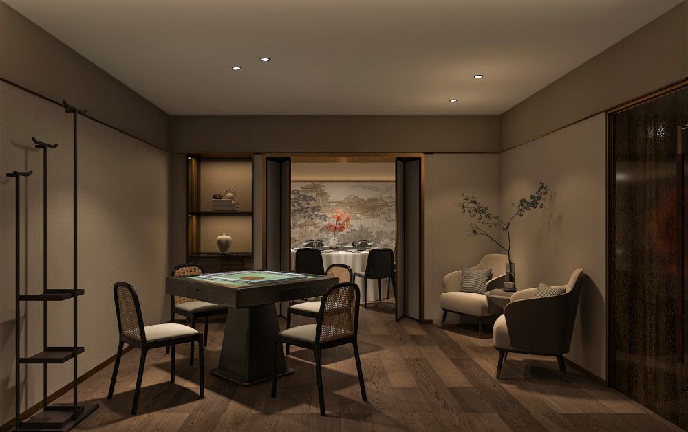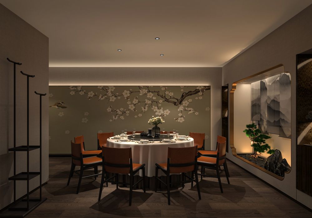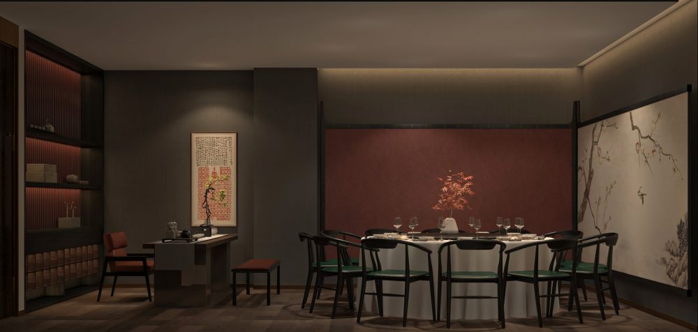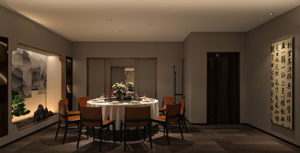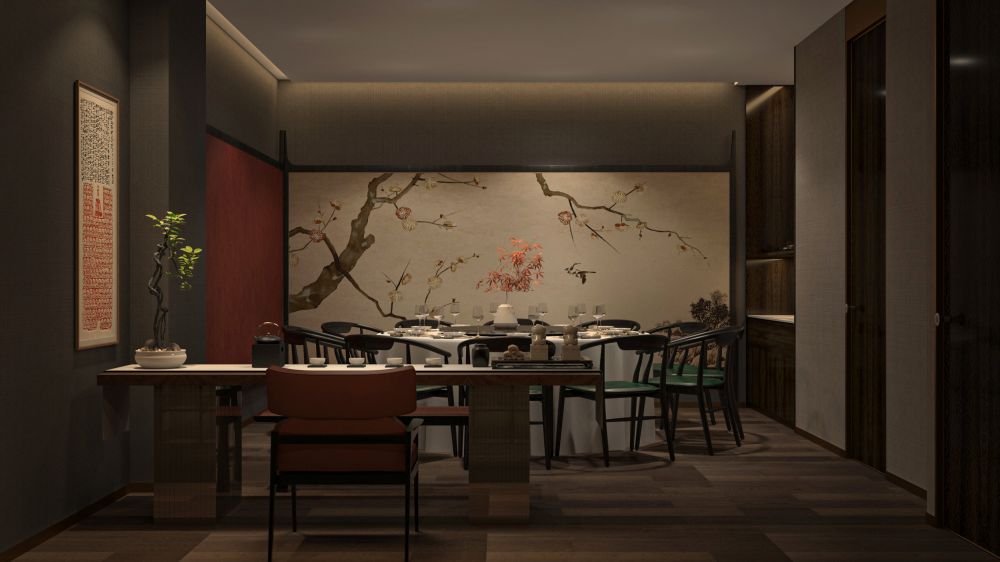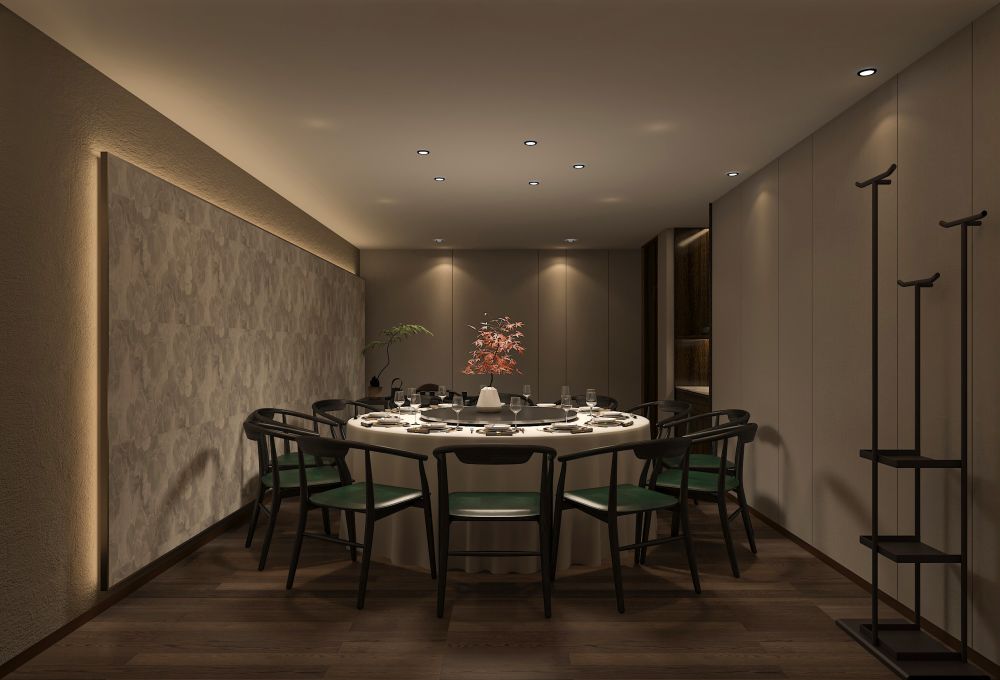 餐厅的定位是为精致高级的苏式菜品牌,包厢占比大。因此,设计师对建筑的内在空间进行了合理化布局,使用深色木饰面结合白色石材,地面用劳伦黑金大砖,把原本不大的前厅,设计成充满江南朦胧韵味的散客区,奠定整个空间的基调与品格,使这里成为顾客的第一道视觉盛宴。结合墙面上的竹、艺术墙布等装饰