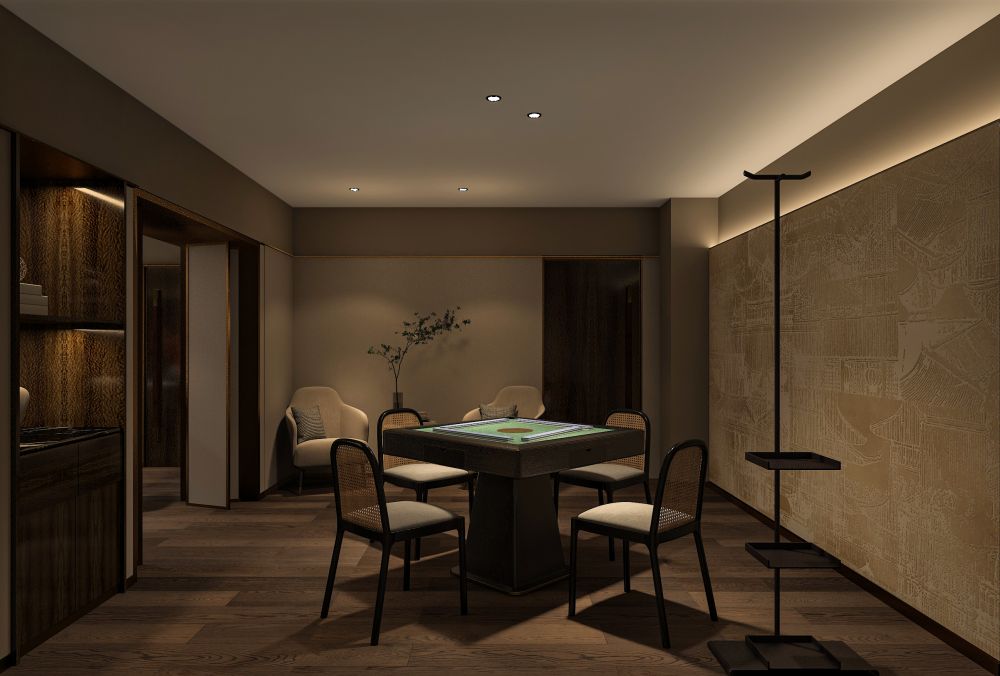 散落在楼梯的2边,设计师采用深色木饰面,简洁线条结合静谧氛围,强化空间的古韵。而略显古旧朦胧的艺术墙布和光影的流动,又柔化了界限感,让空间细节欲隐还显,细腻又生动。刺绣、花鸟、国画等元素,巧妙地藏于空间,或隐约,或层叠,升华了江南意境,丰富了视觉感受