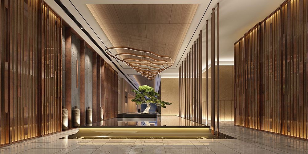 秦皇岛因秦始皇东巡至此派人入海求仙而得名,希望从水和海洋为灵感切入,同时顺应整个万怡酒店的现代轻奢氛围,结合精致奢华用餐体验,从入口开启了一次扬帆远航,船桨造型的阵列和水纹玻璃赋予的海洋寓意,让空间故事揭开探寻的序幕。